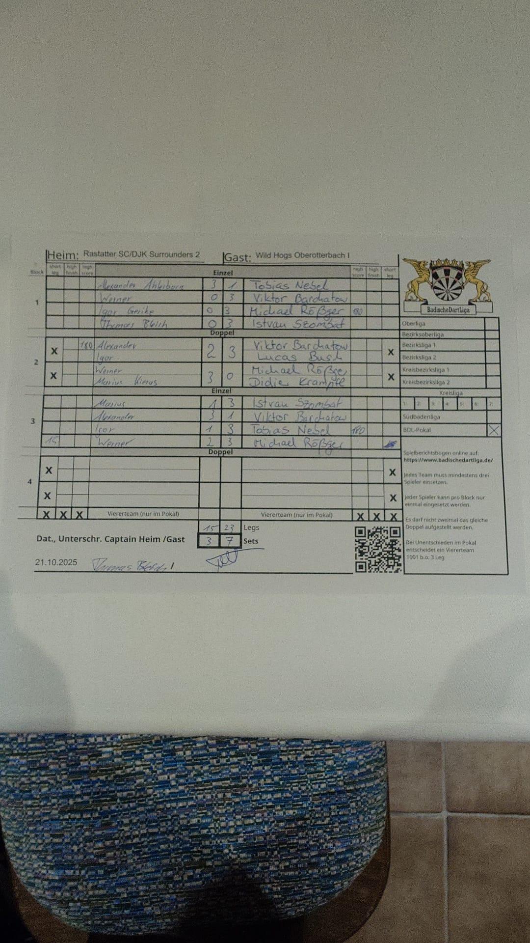 | Ergebnis: | 15 : 29 | - Legs | ||||||