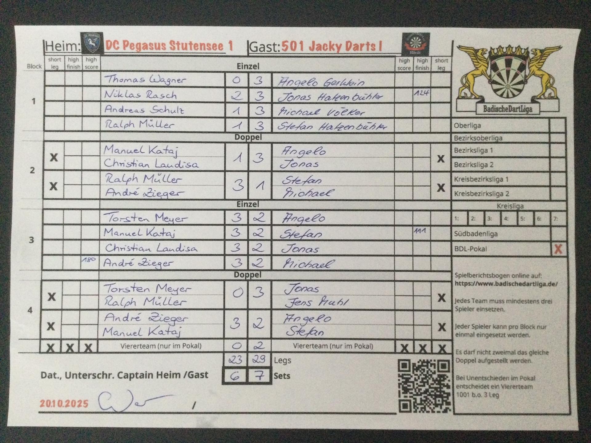 | HEIM: | DC Pegasus Stutensee 1 | GAST: | 501 Jacky Darts I | |||||