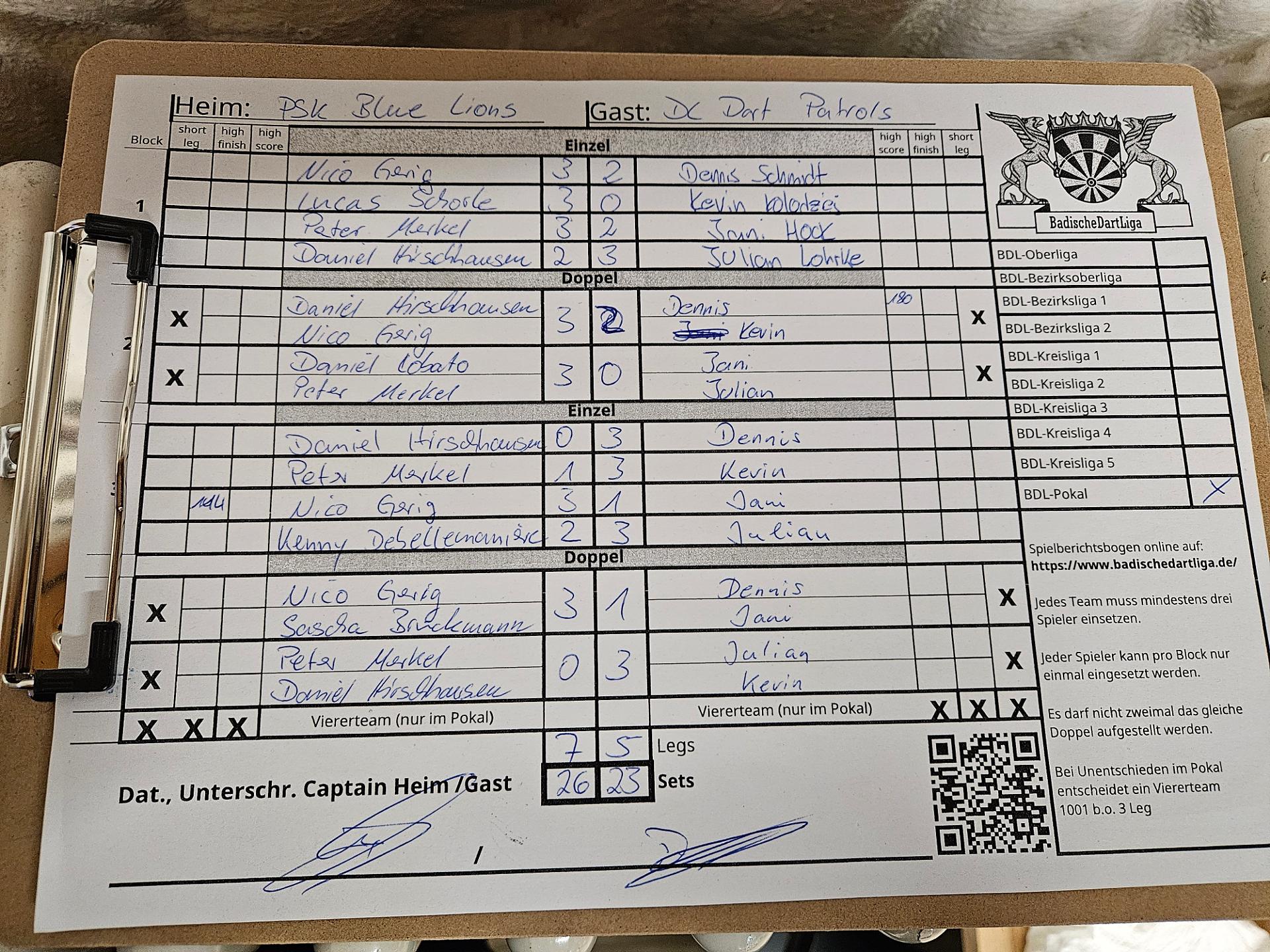 | Ergebnis: | 26 : 23 | - Legs | ||||||