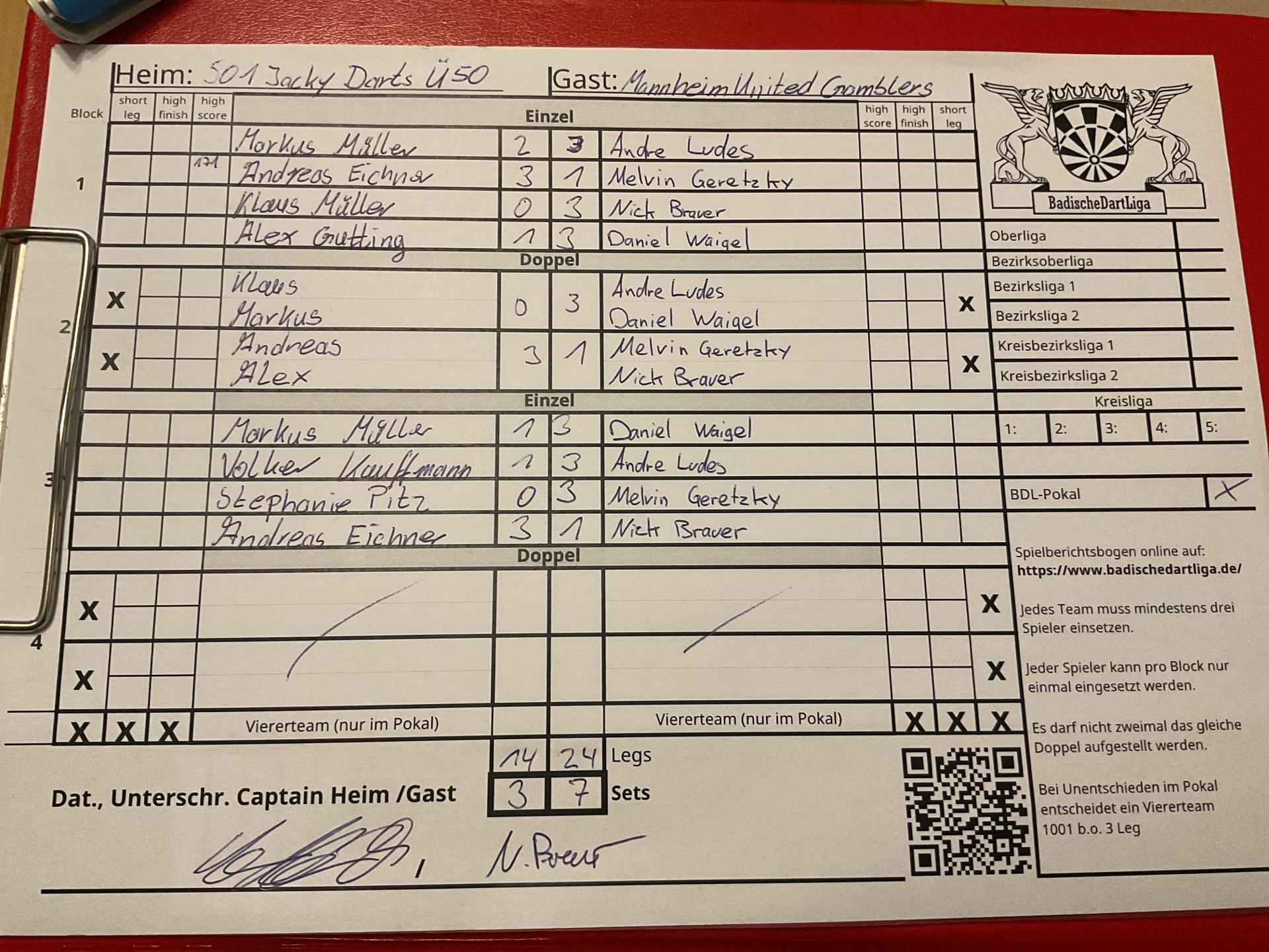 | HEIM: | 501 Jacky Darts Ü50 | GAST: | Mannheim United Gamblers | |||||