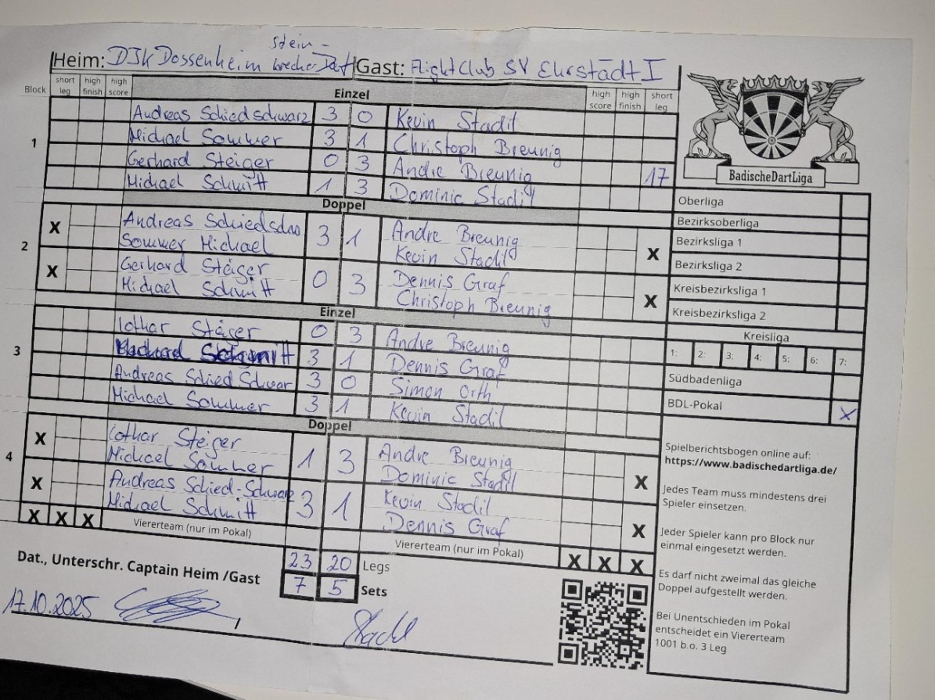 | HEIM: | DJK Dossenheim 1927 e. V. Steinbrecher Dart | GAST: | Flight Club SV Ehrstädt I | |||||
