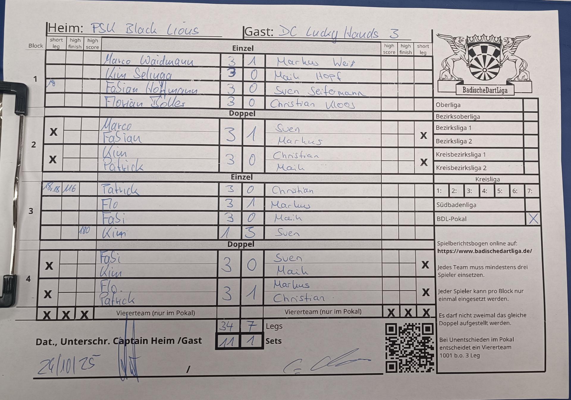 | Ergebnis: | 34 : 7 | - Legs | ||||||