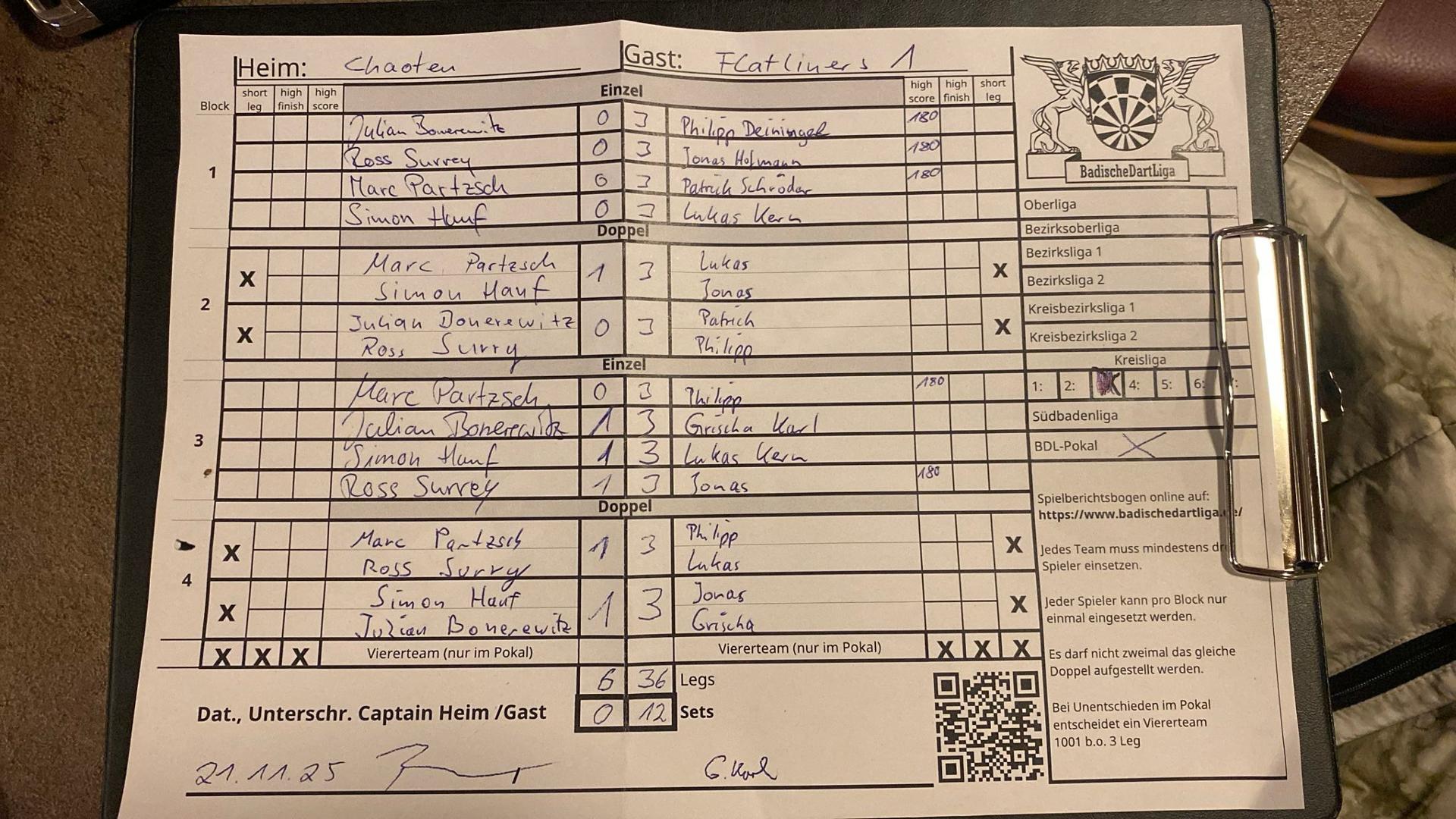 | Ergebnis: | 6 : 36 | - Legs | ||||||
