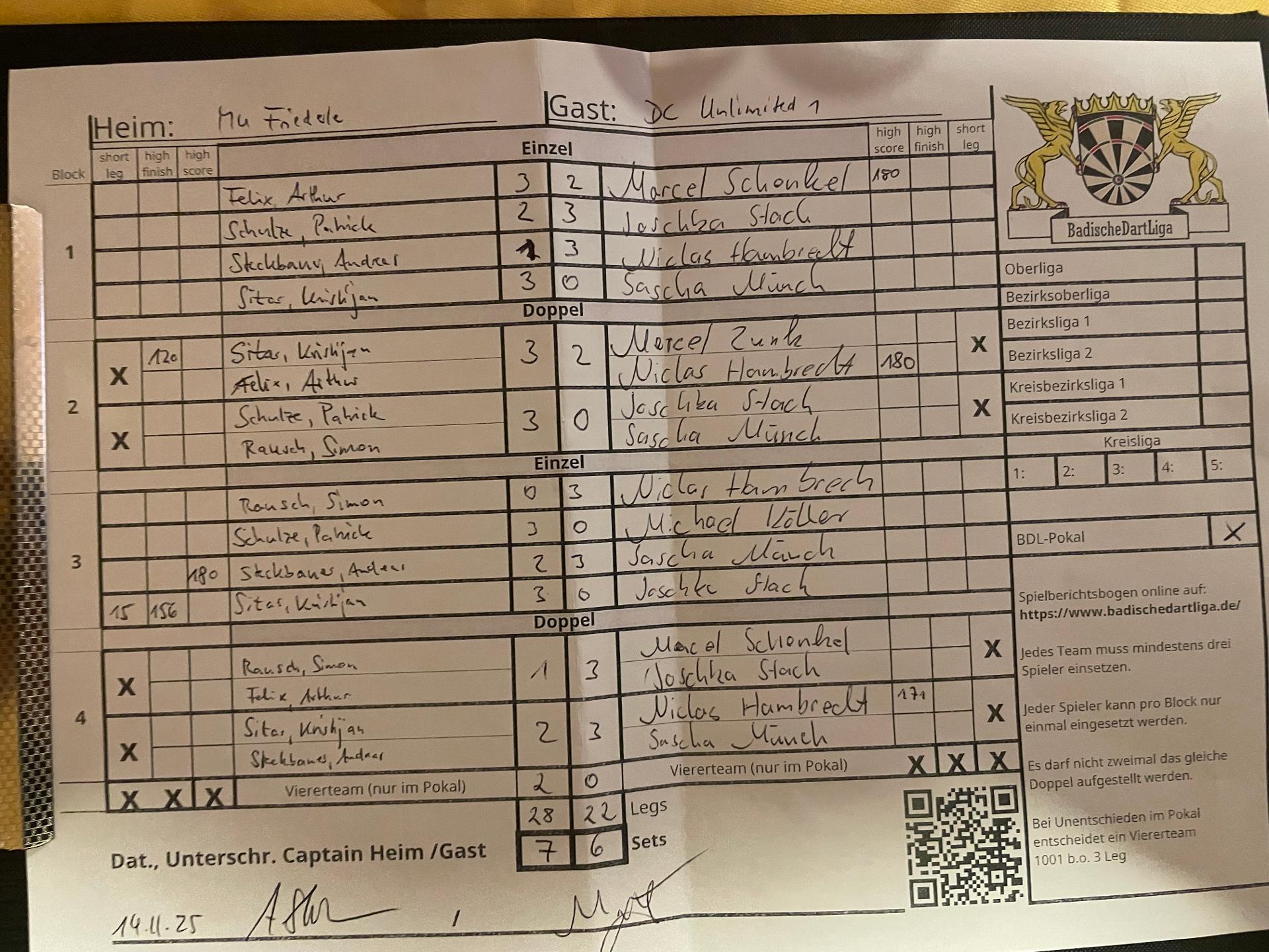 | Ergebnis: | 28 : 22 | - Legs | ||||||