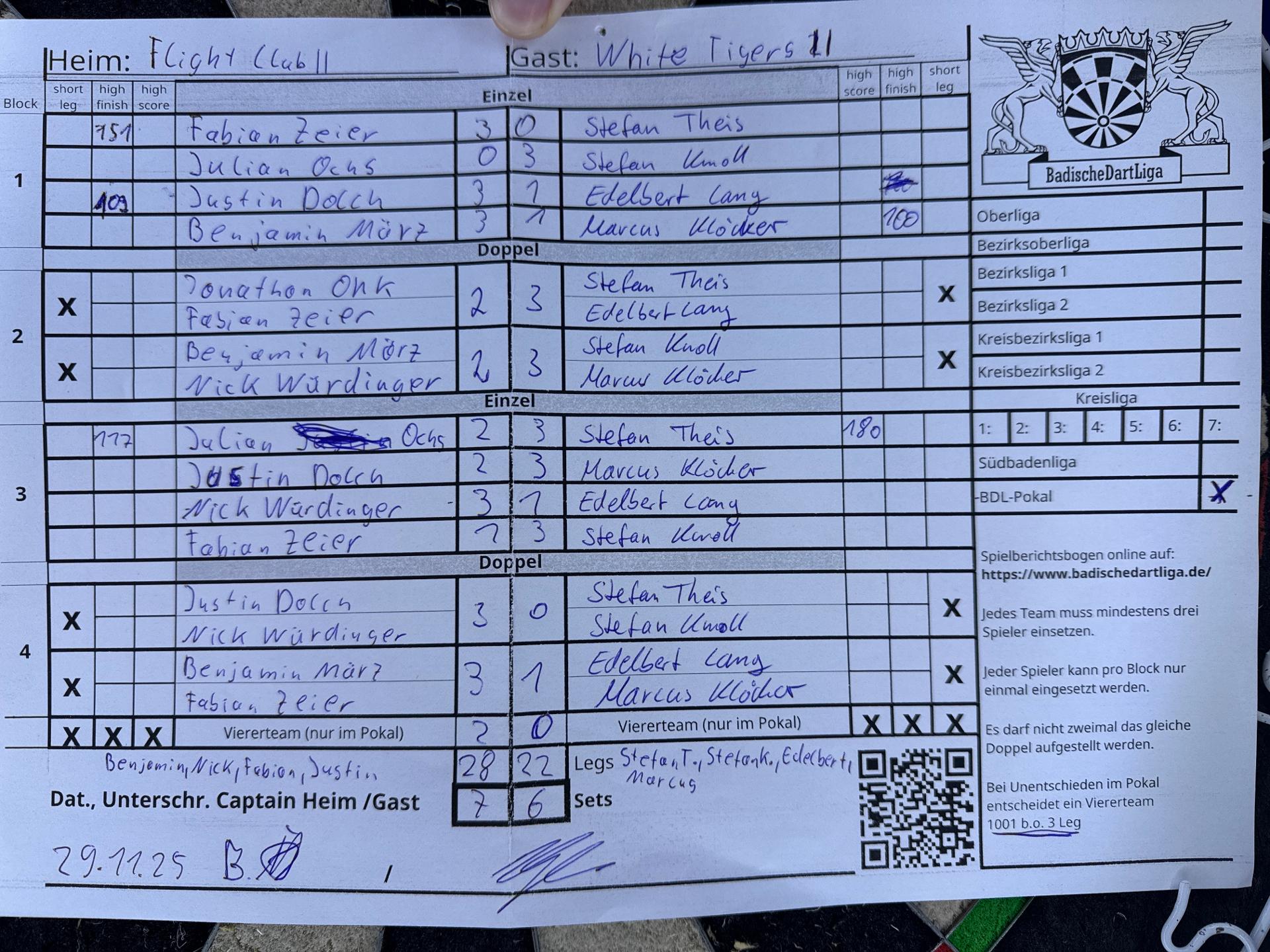 | Ergebnis: | 29 : 22 | - Legs | ||||||