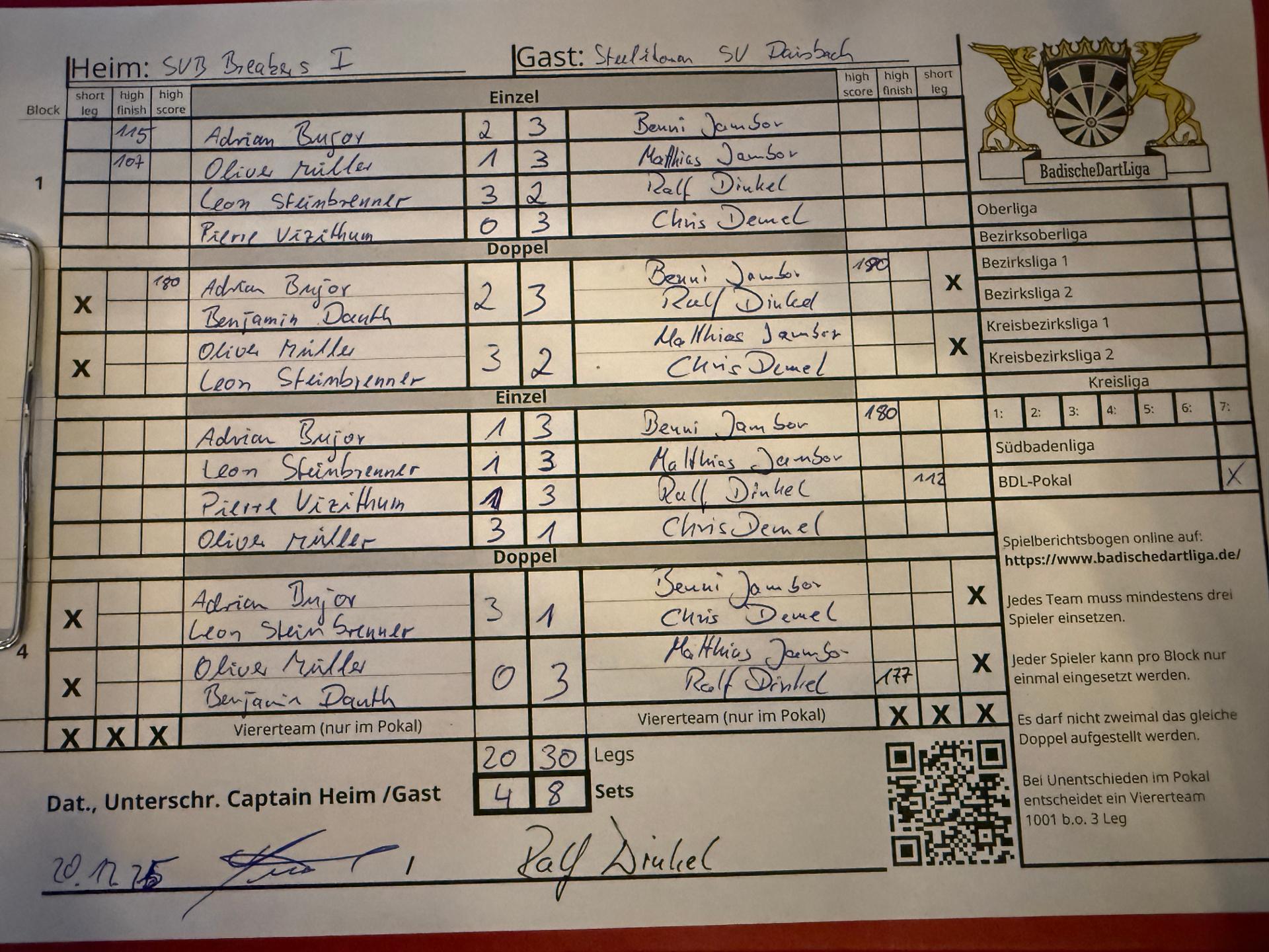 | Ergebnis: | 20 : 30 | - Legs | ||||||
