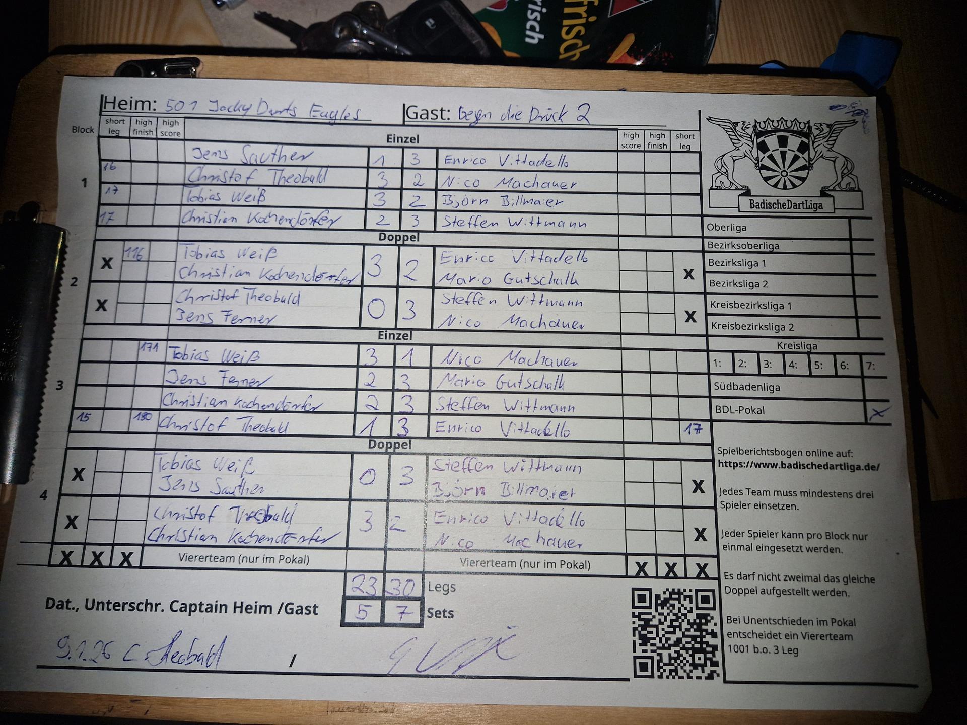 | HEIM: | 501 Jacky Darts Eagles | GAST: | DC Gegen die Drück Sandhausen 2 | |||||