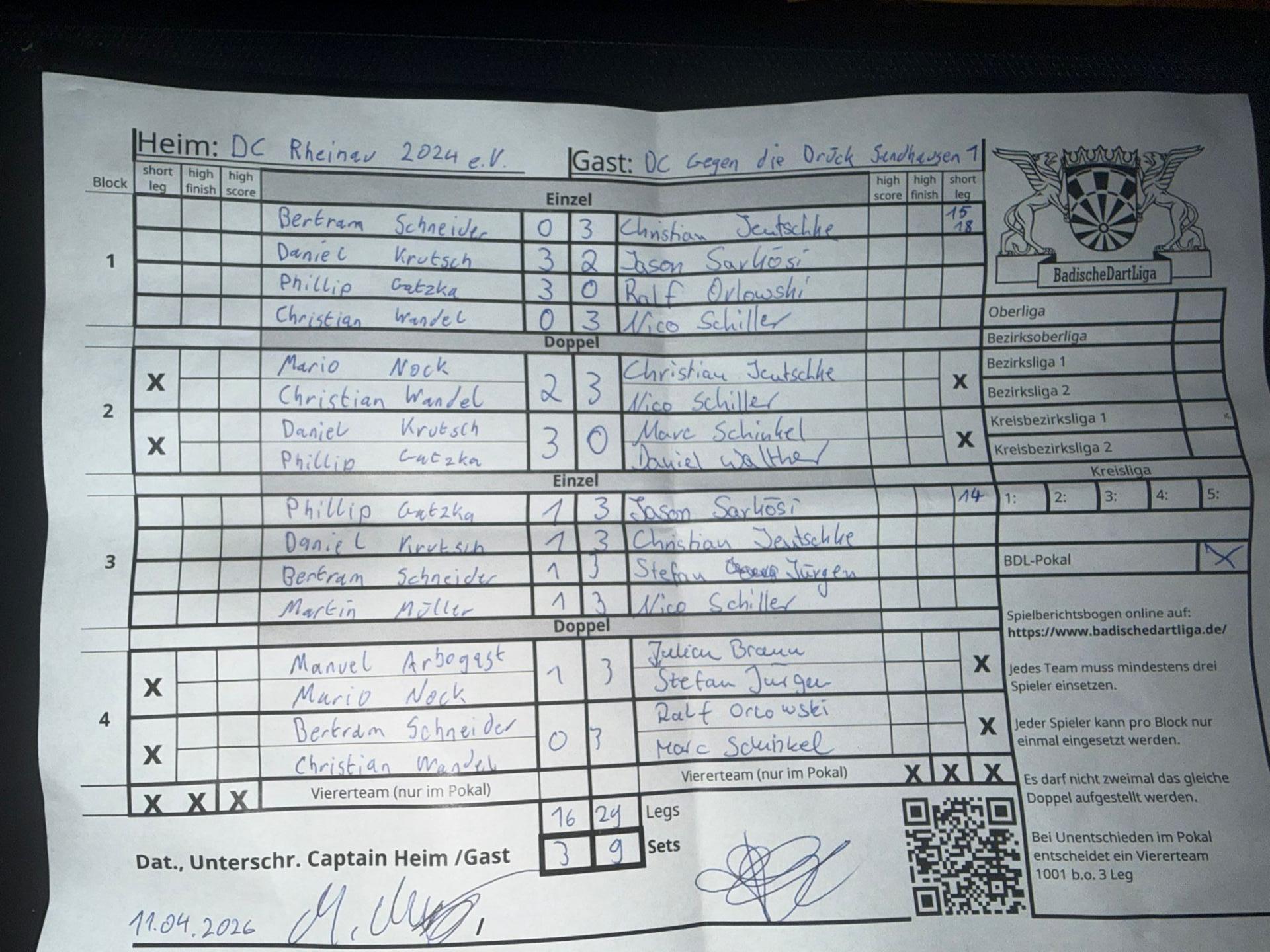 | HEIM: | Dart Club Rheinau 2024 e.V. | GAST: | DC Gegen die Drück Sandhausen 1 | |||||