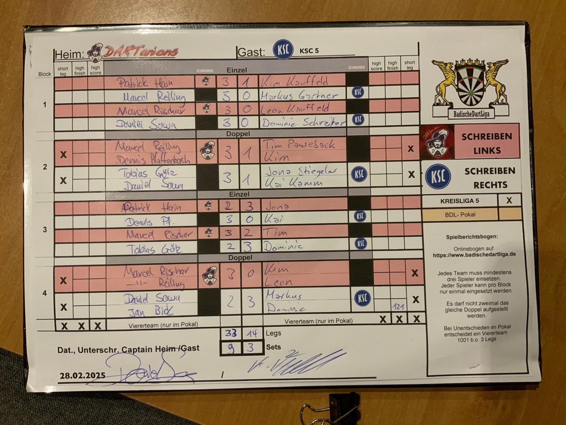 | Ergebnis: | 33 : 14 | - Legs | ||||||