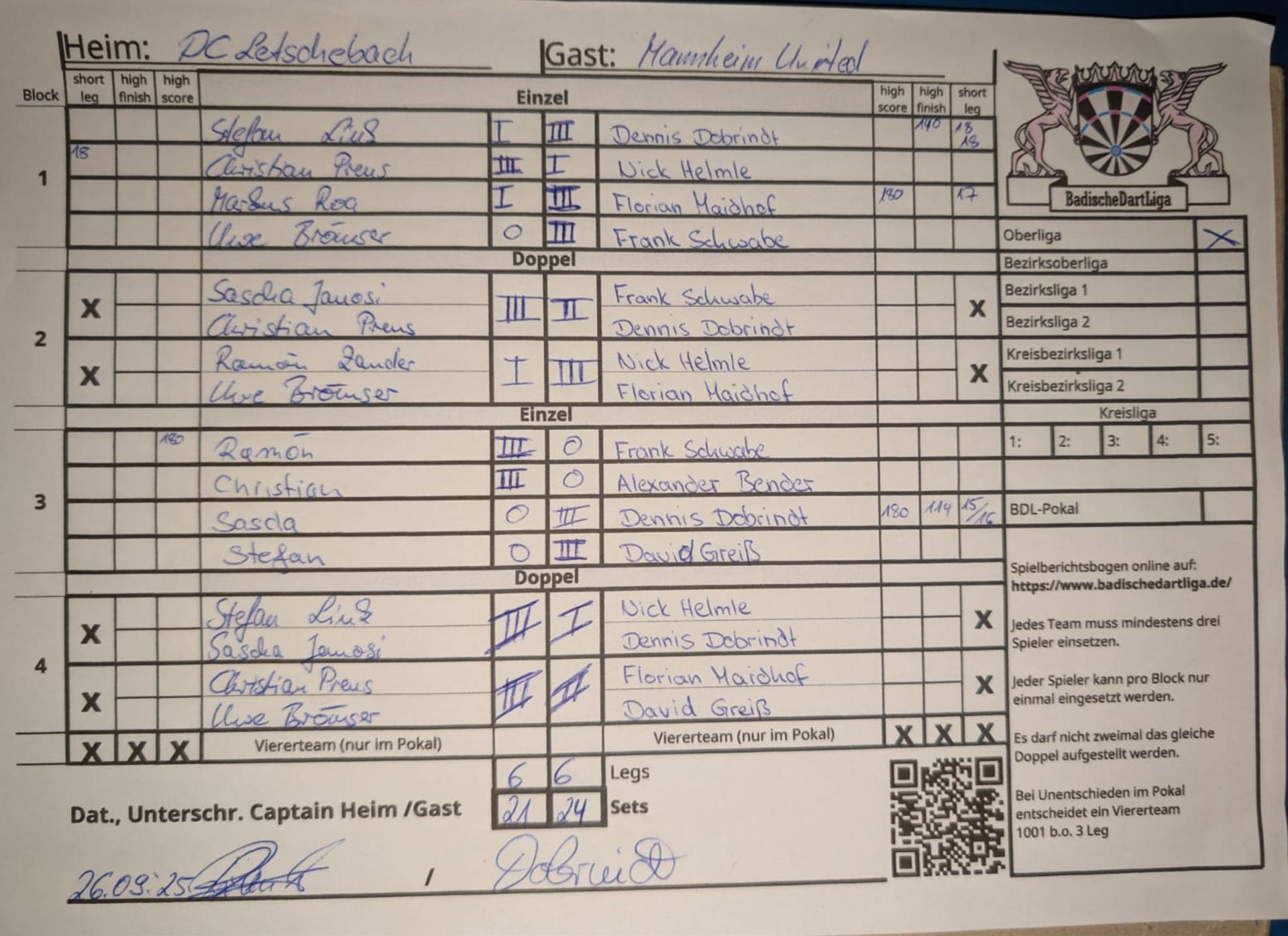 | Ergebnis: | 21 : 24 | - Legs | ||||||