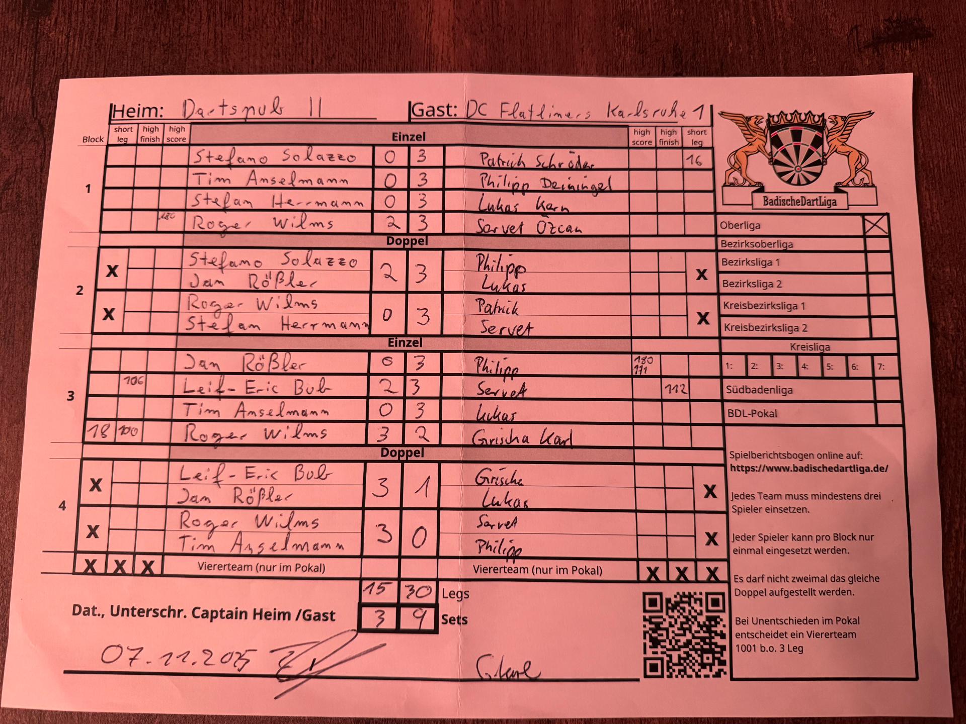 | Ergebnis: | 15 : 30 | - Legs | ||||||