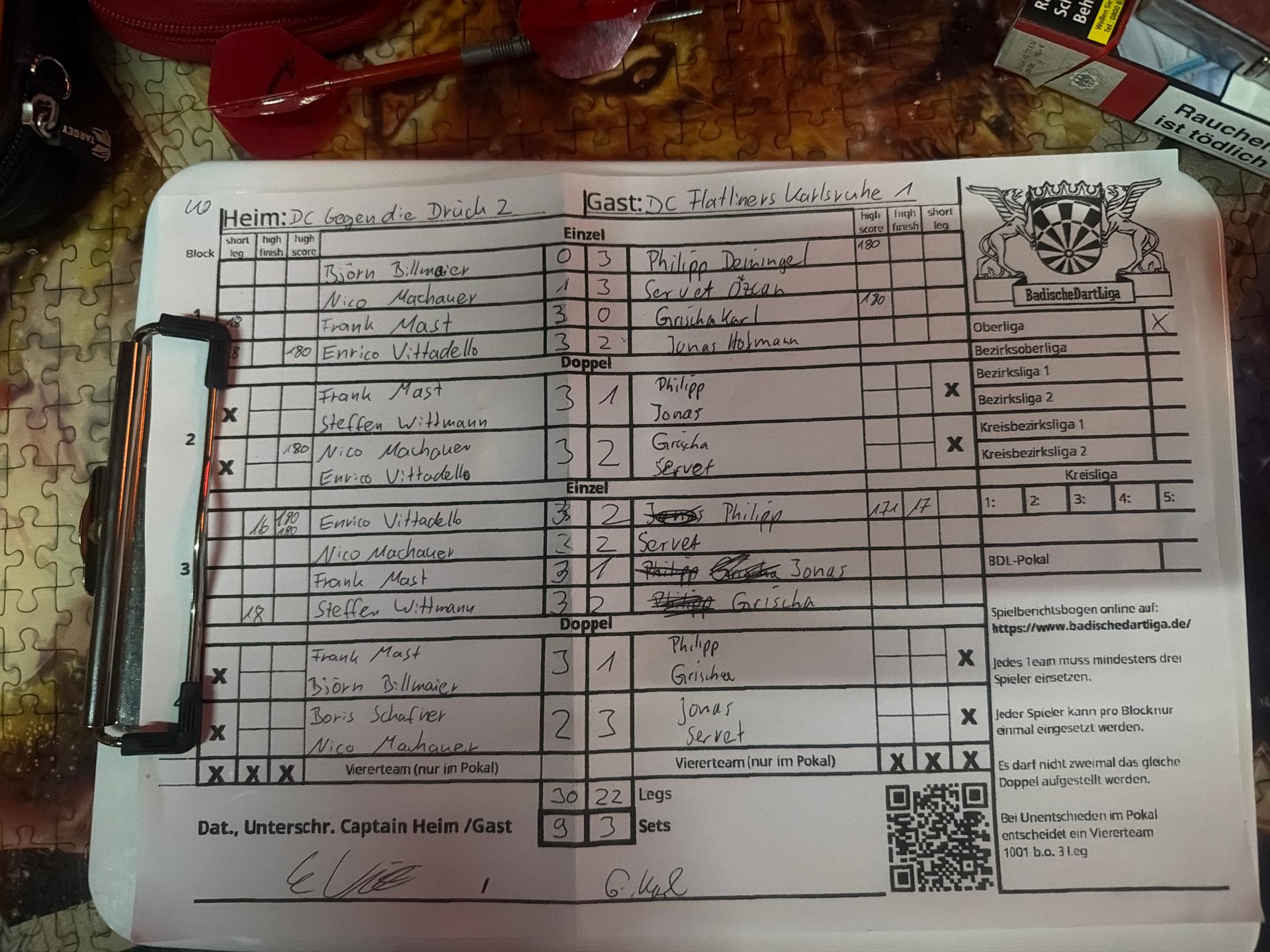 | Ergebnis: | 30 : 22 | - Legs | ||||||