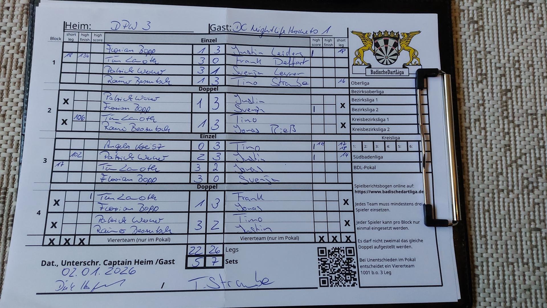 | Ergebnis: | 22 : 26 | - Legs | ||||||