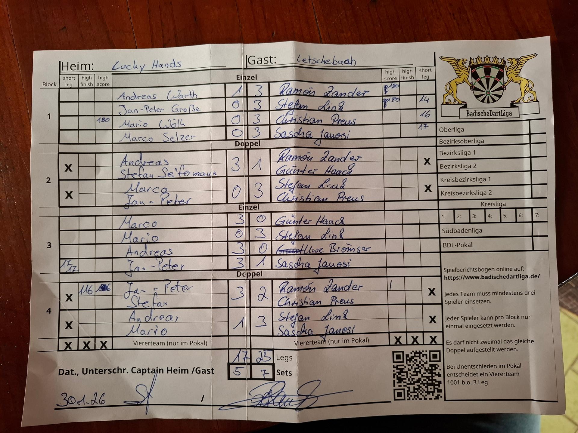 | Ergebnis: | 17 : 25 | - Legs | ||||||