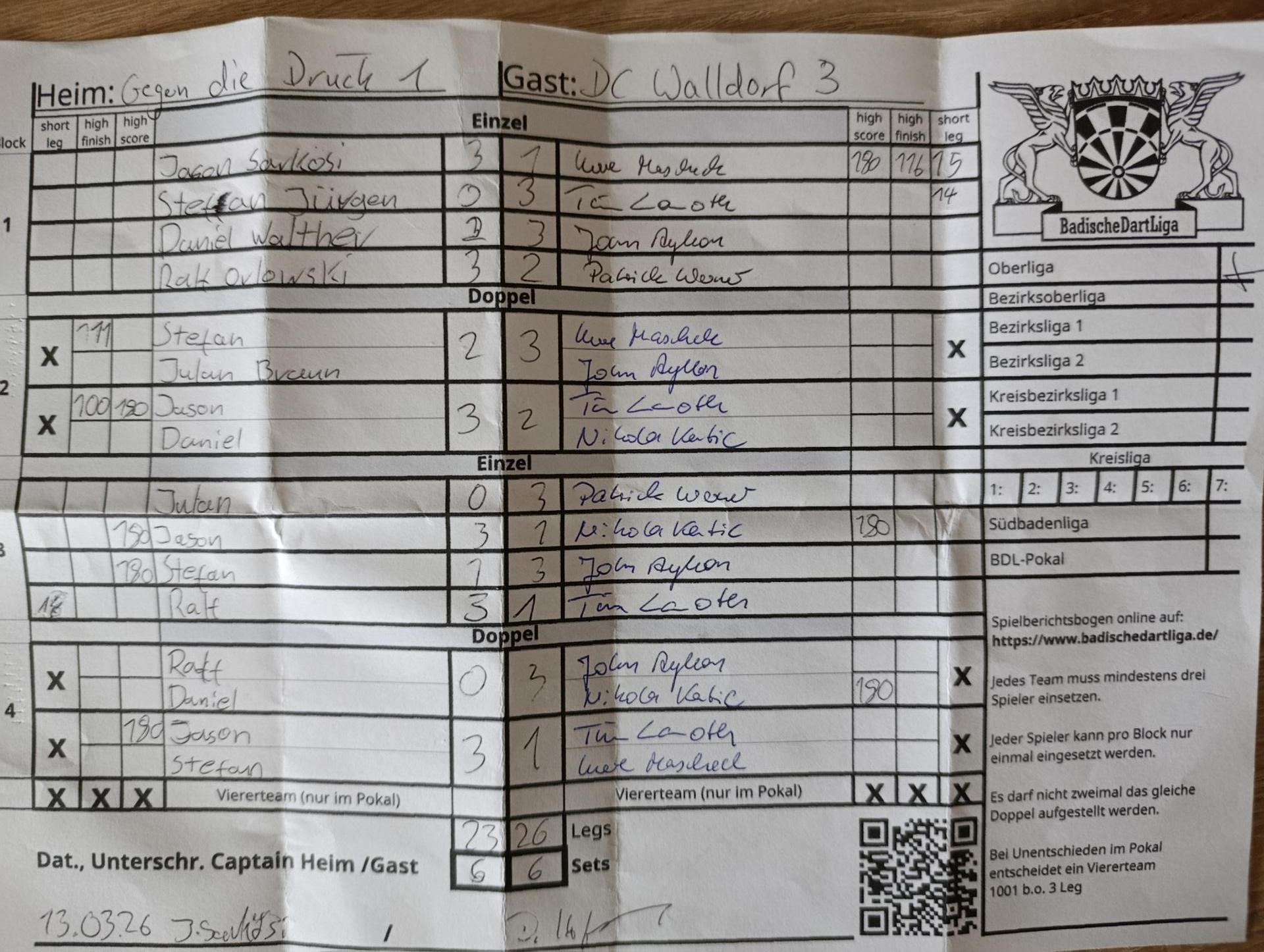 | HEIM: | DC Gegen die Drück Sandhausen 1 | GAST: | Darts Pub Walldorf 3 | |||||