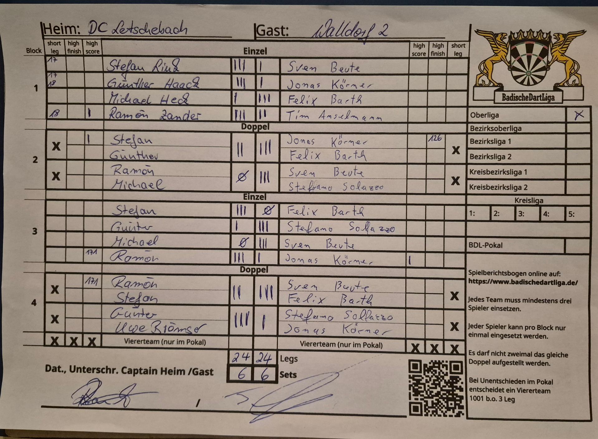 | Ergebnis: | 24 : 24 | - Legs | ||||||