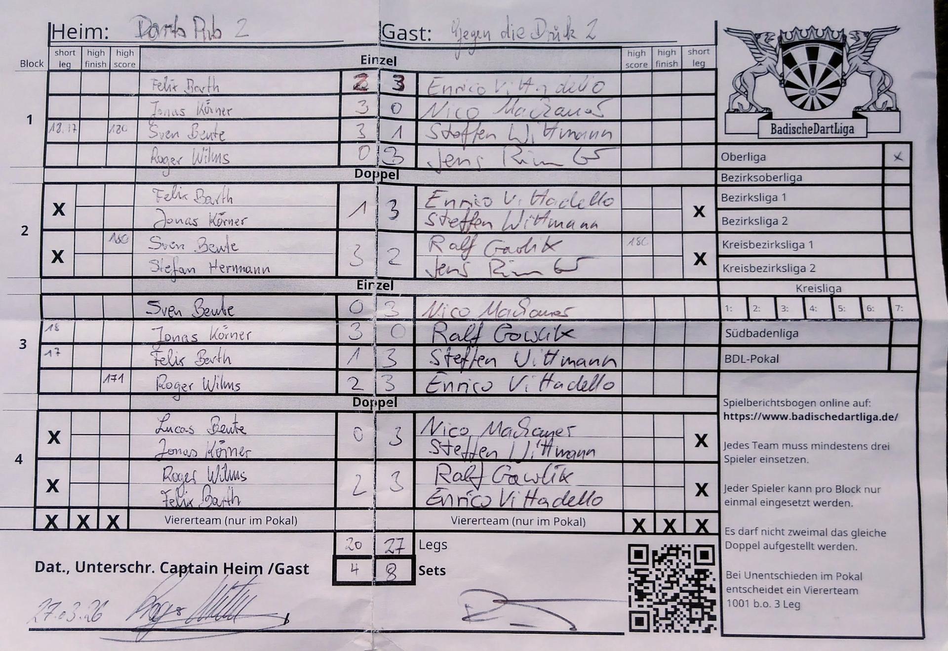 | Ergebnis: | 20 : 27 | - Legs | ||||||