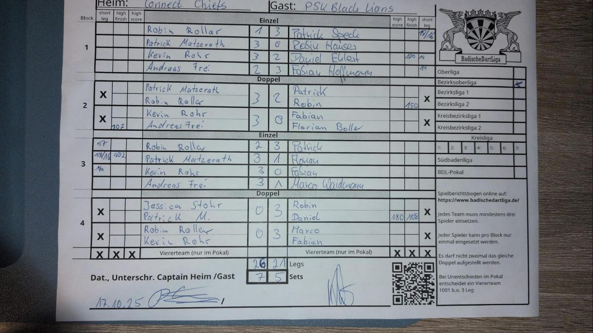 | Ergebnis: | 26 : 21 | - Legs | ||||||