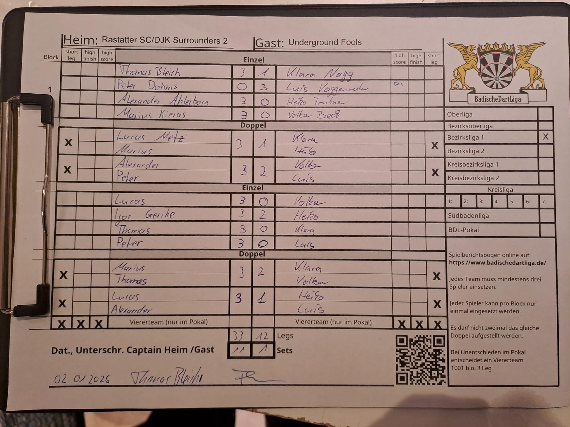 | Ergebnis: | 33 : 12 | - Legs | ||||||
