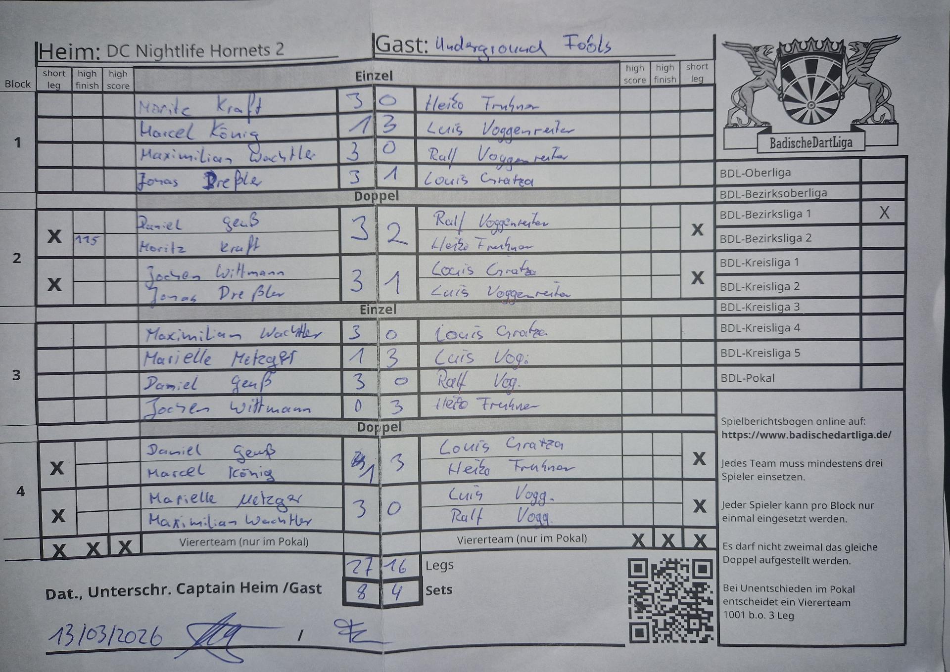 | Ergebnis: | 27 : 16 | - Legs | ||||||