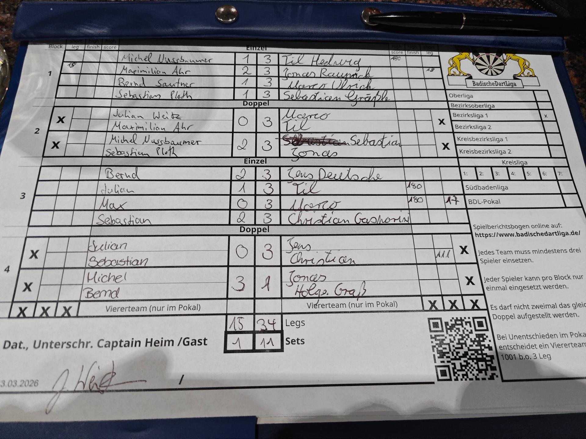 | Ergebnis: | 15 : 34 | - Legs | ||||||