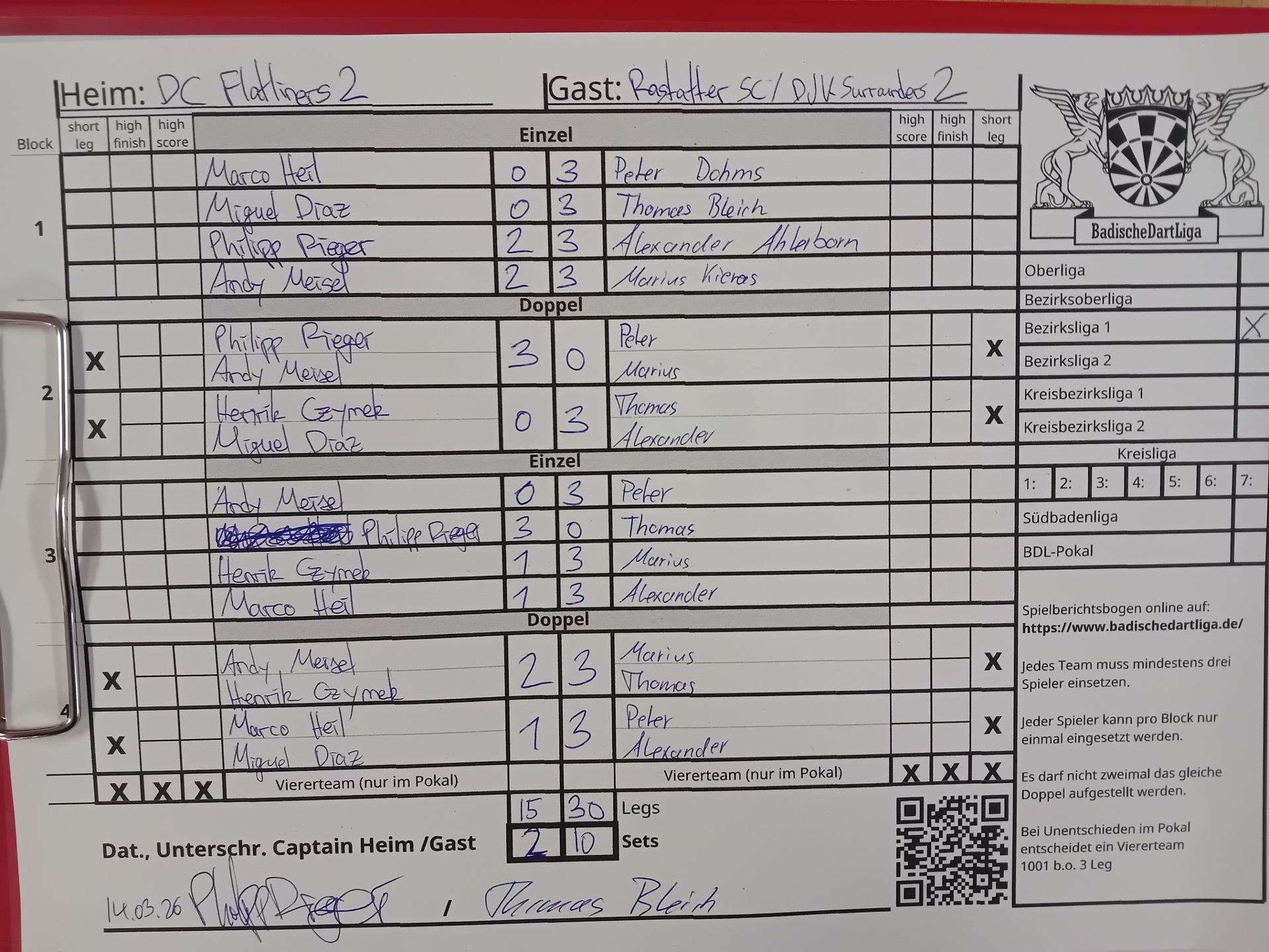 | Ergebnis: | 15 : 30 | - Legs | ||||||