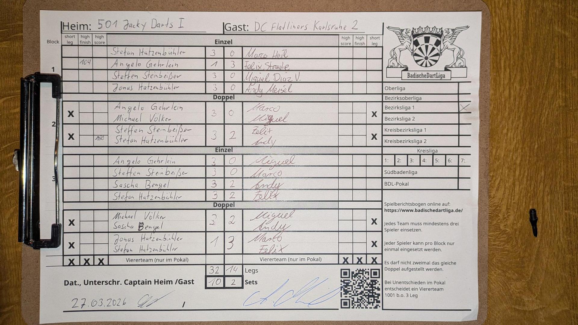 | Ergebnis: | 32 : 14 | - Legs | ||||||