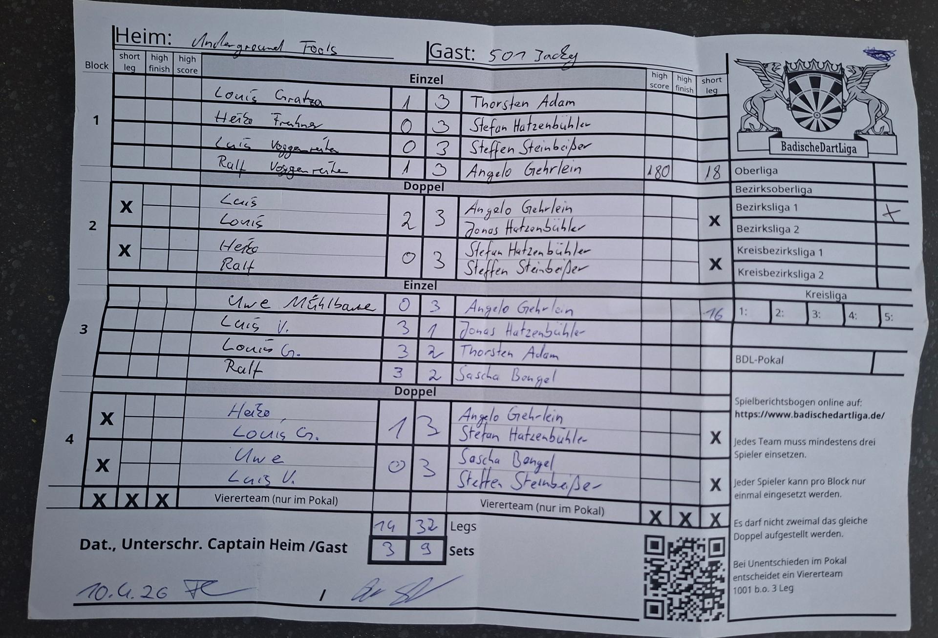 | Ergebnis: | 14 : 32 | - Legs | ||||||