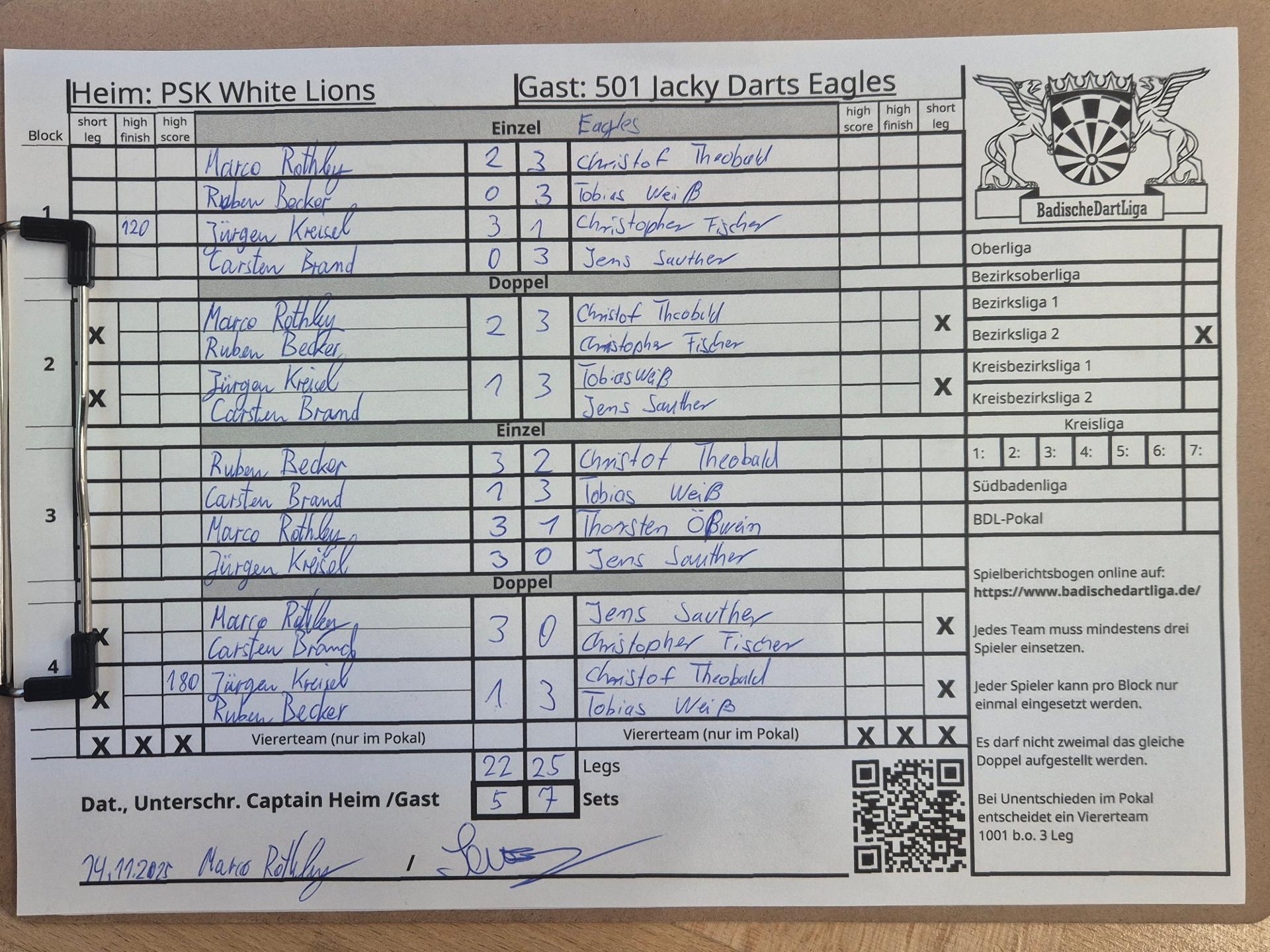 | HEIM: | PSK White Lions | GAST: | 501 Jacky Darts Eagles | |||||