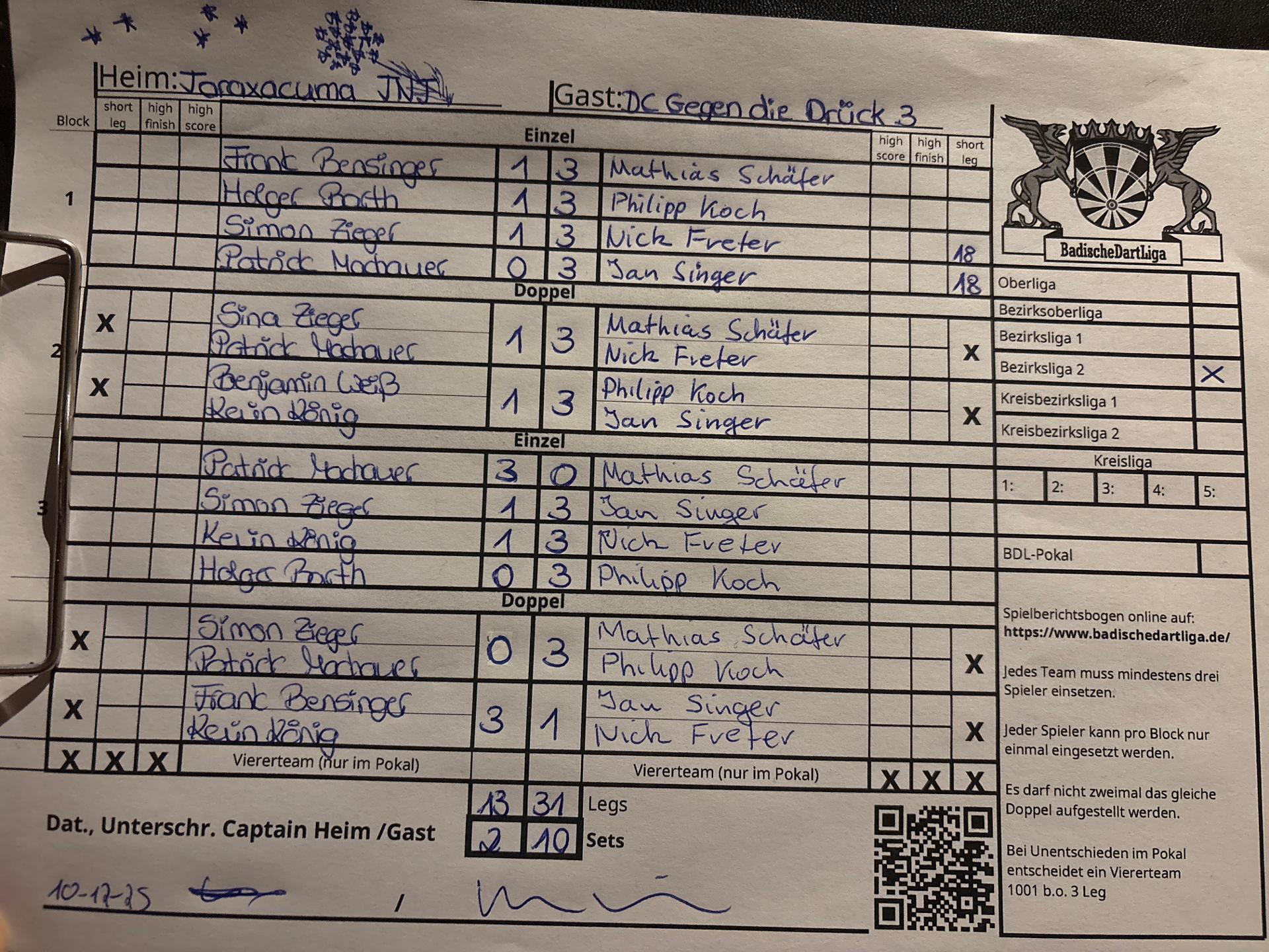 | Ergebnis: | 13 : 31 | - Legs | ||||||