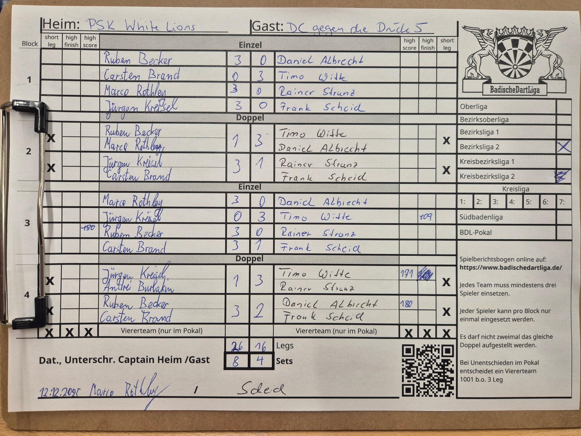 | Ergebnis: | 26 : 16 | - Legs | ||||||