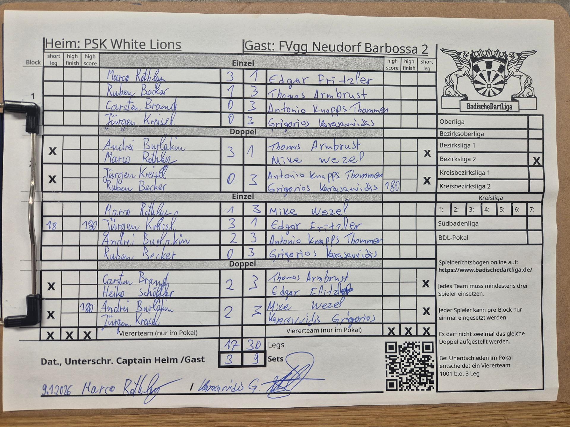 | Ergebnis: | 17 : 30 | - Legs | ||||||