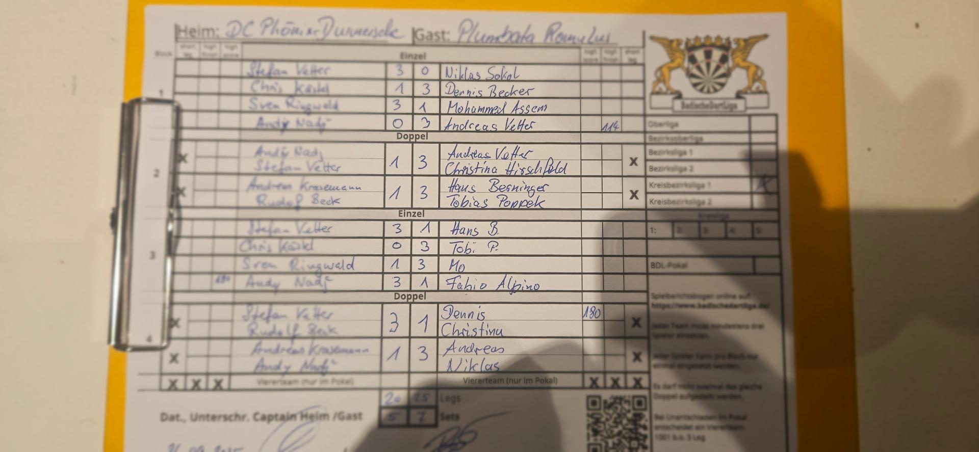 | Ergebnis: | 20 : 25 | - Legs | ||||||