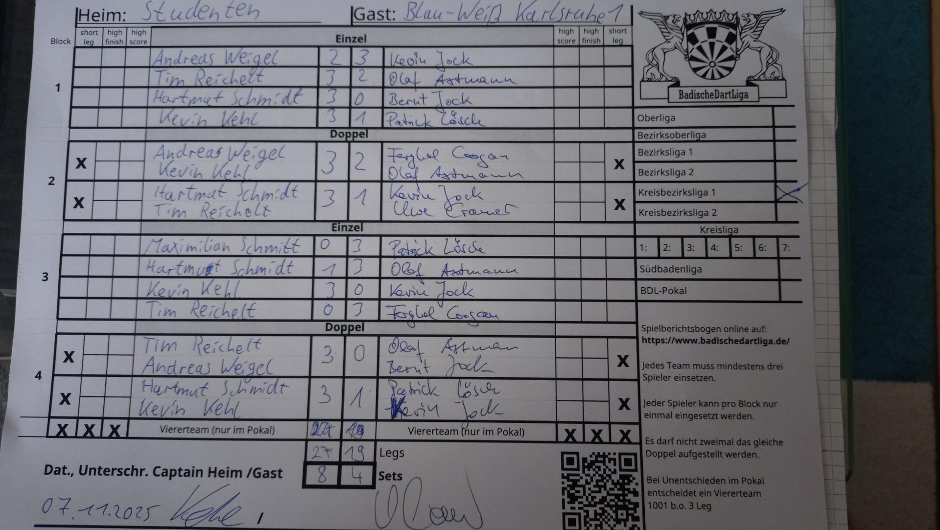 | HEIM: | 501 Jacky Darts Studenten | GAST: | DC Blau-Weiß Karlsruhe 1 | |||||