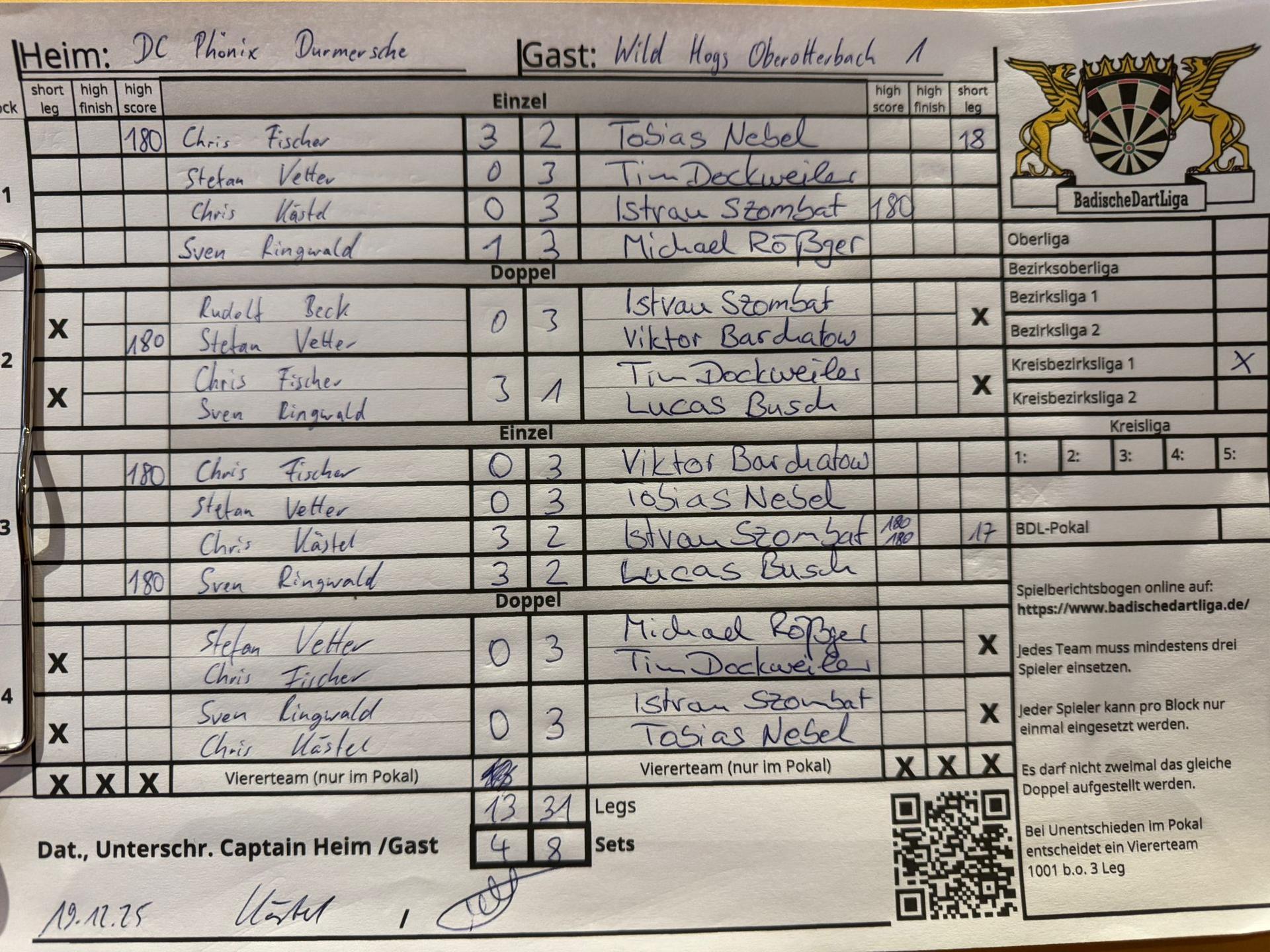 | Ergebnis: | 13 : 31 | - Legs | ||||||