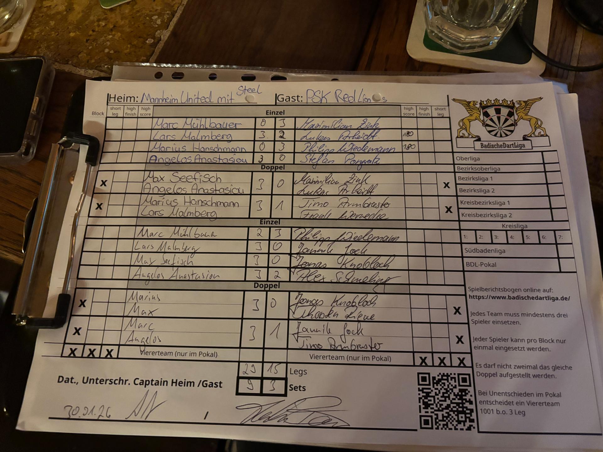 | Ergebnis: | 29 : 15 | - Legs | ||||||