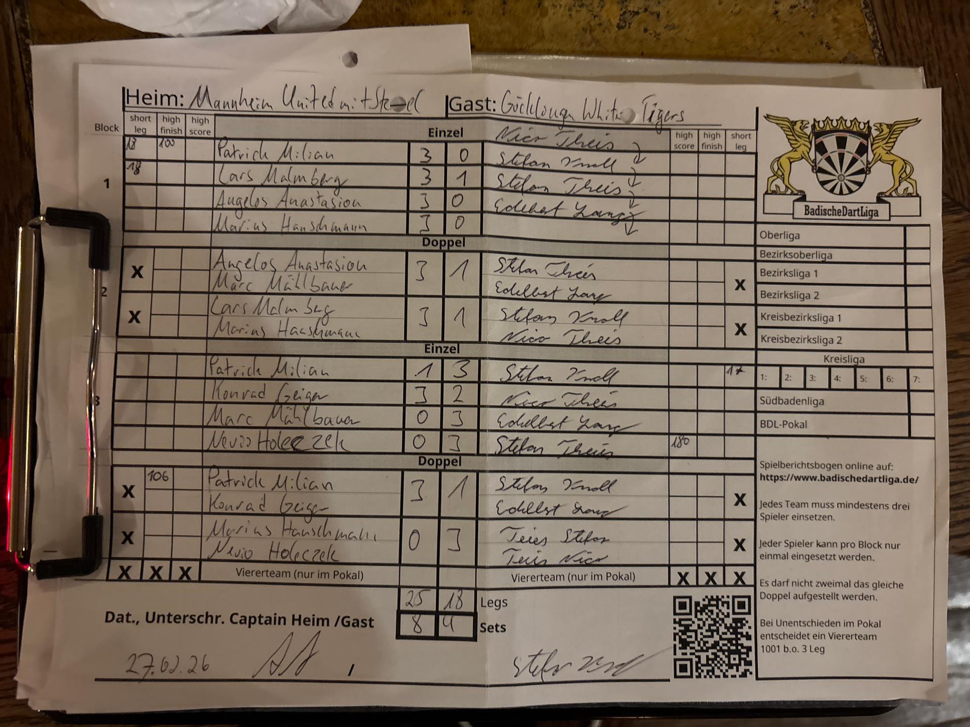| Ergebnis: | 25 : 18 | - Legs | ||||||