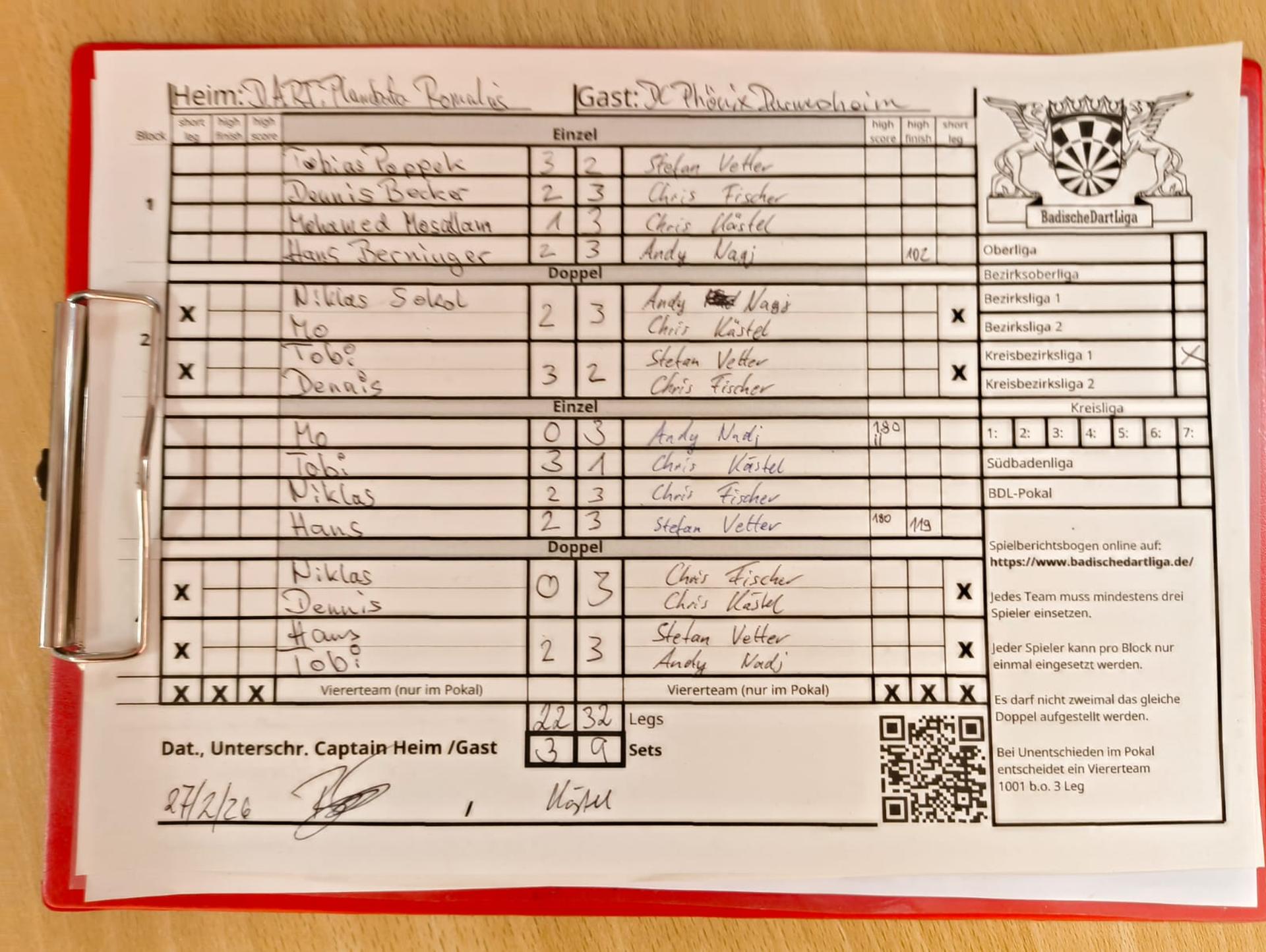 | Ergebnis: | 22 : 32 | - Legs | ||||||