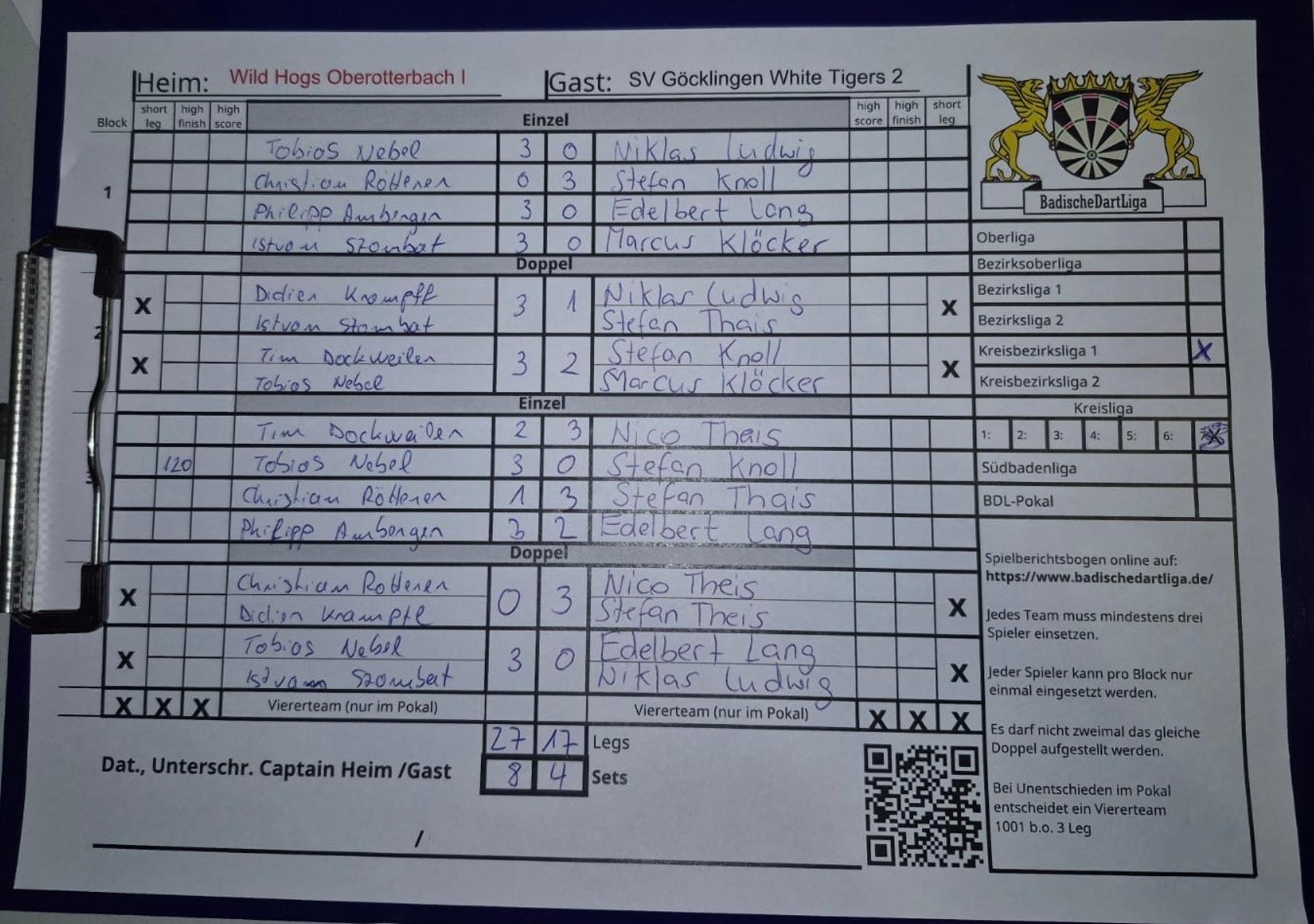 | Ergebnis: | 27 : 17 | - Legs | ||||||