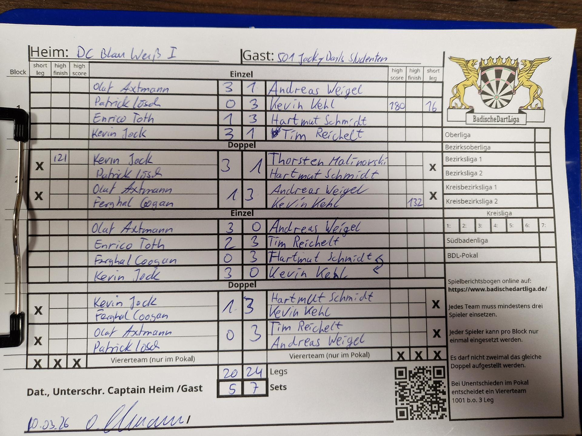 | HEIM: | DC Blau-Weiß Karlsruhe 1 | GAST: | 501 Jacky Darts Studenten | |||||