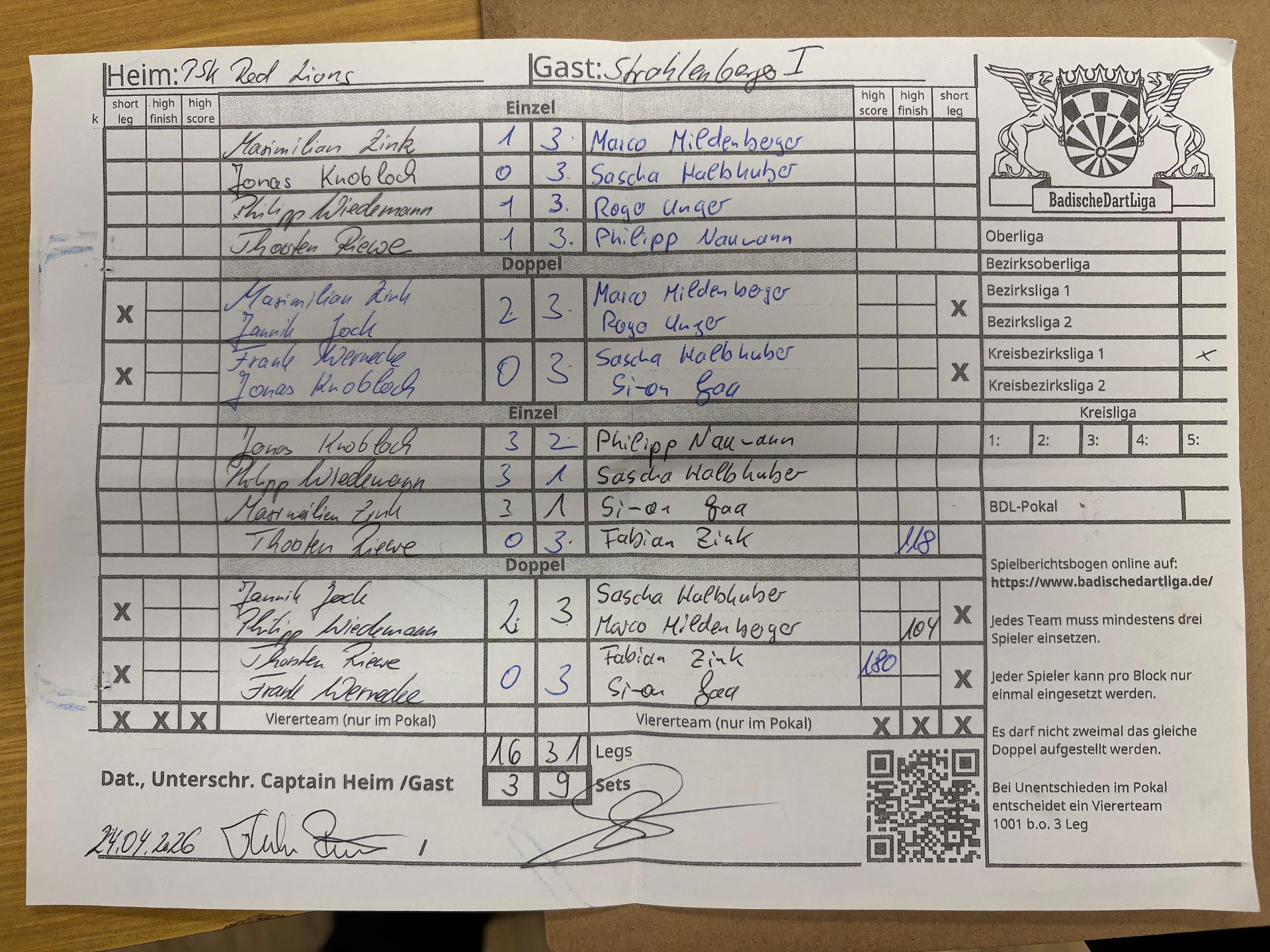 | Ergebnis: | 16 : 31 | - Legs | ||||||