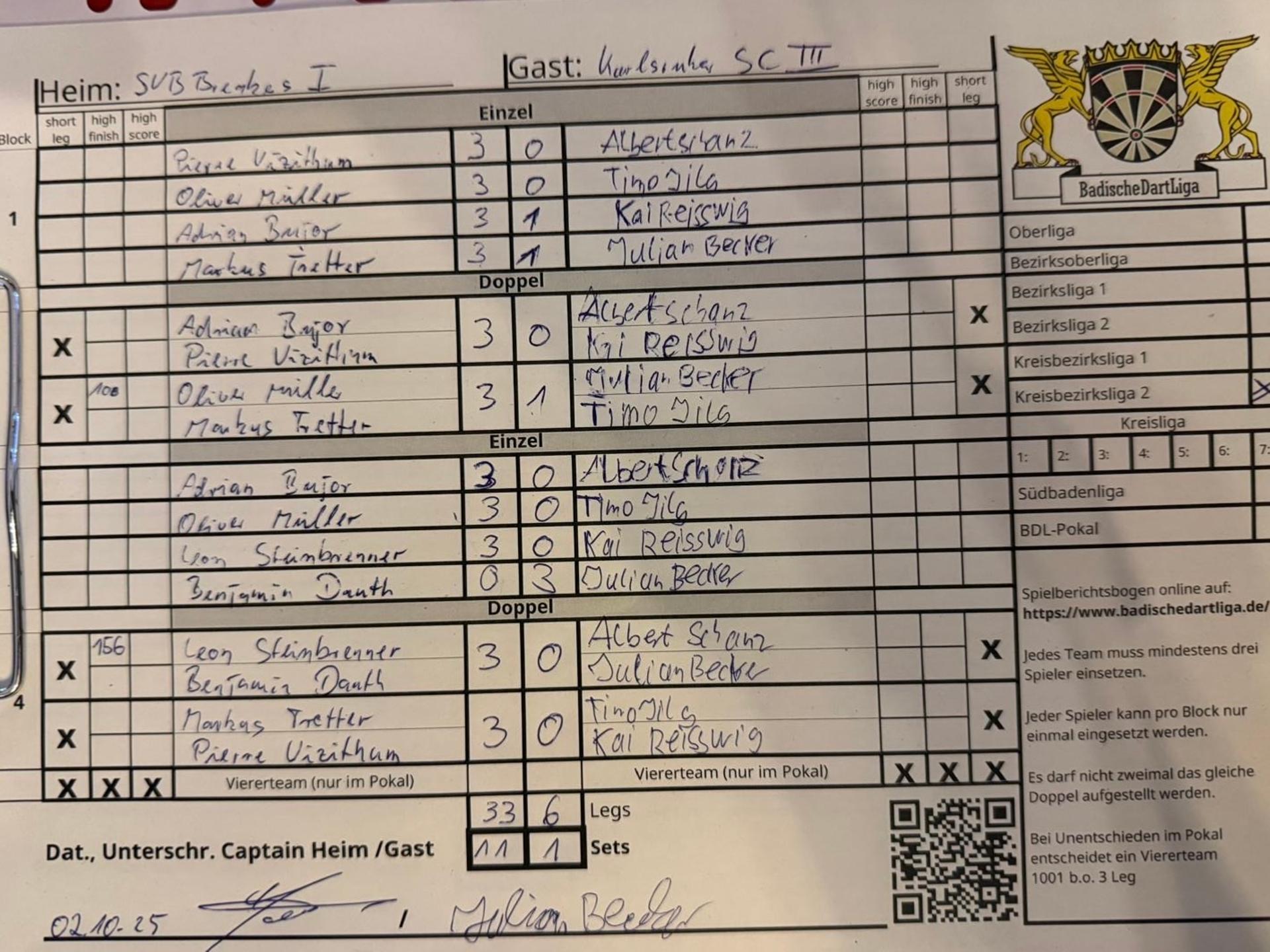 Ergebnis: | 33 : 6 | - Legs | ||||||