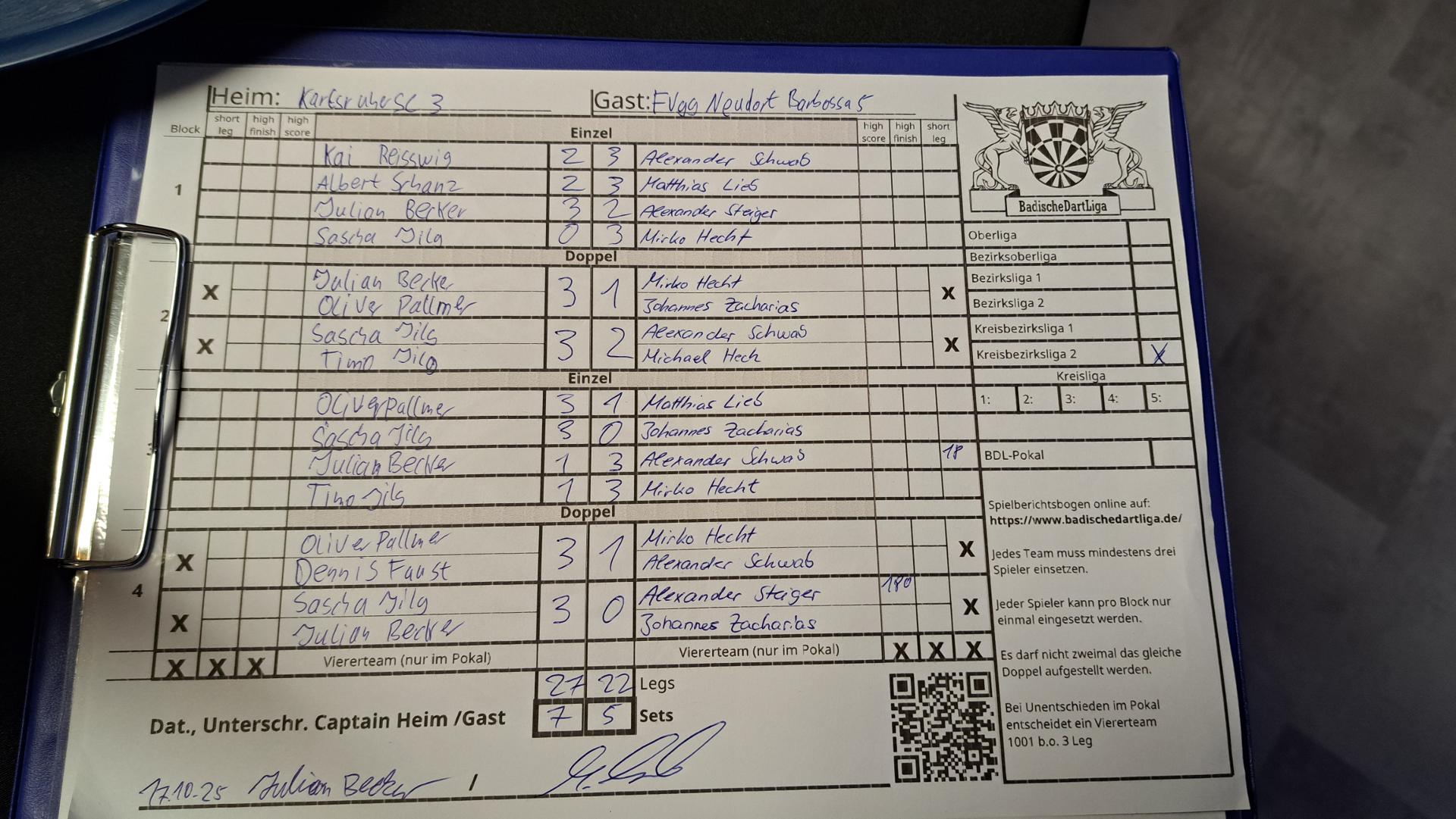 | Ergebnis: | 27 : 22 | - Legs | ||||||