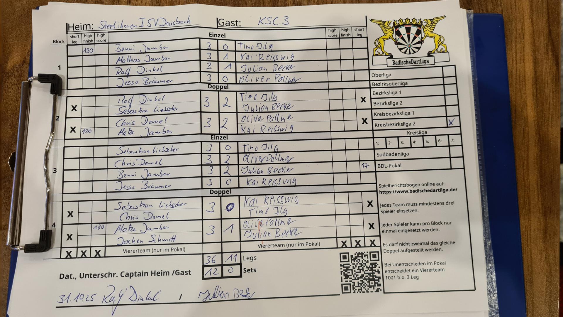 | Ergebnis: | 36 : 11 | - Legs | ||||||
