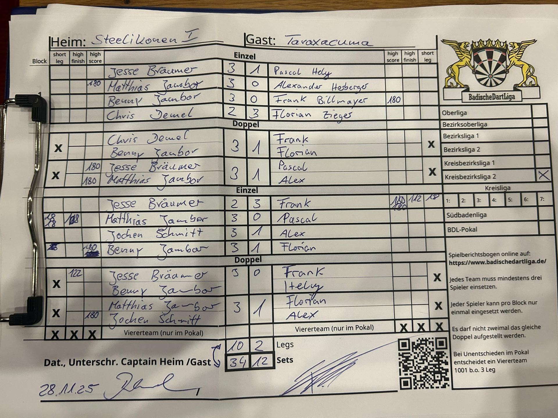 | Ergebnis: | 34 : 12 | - Legs | ||||||