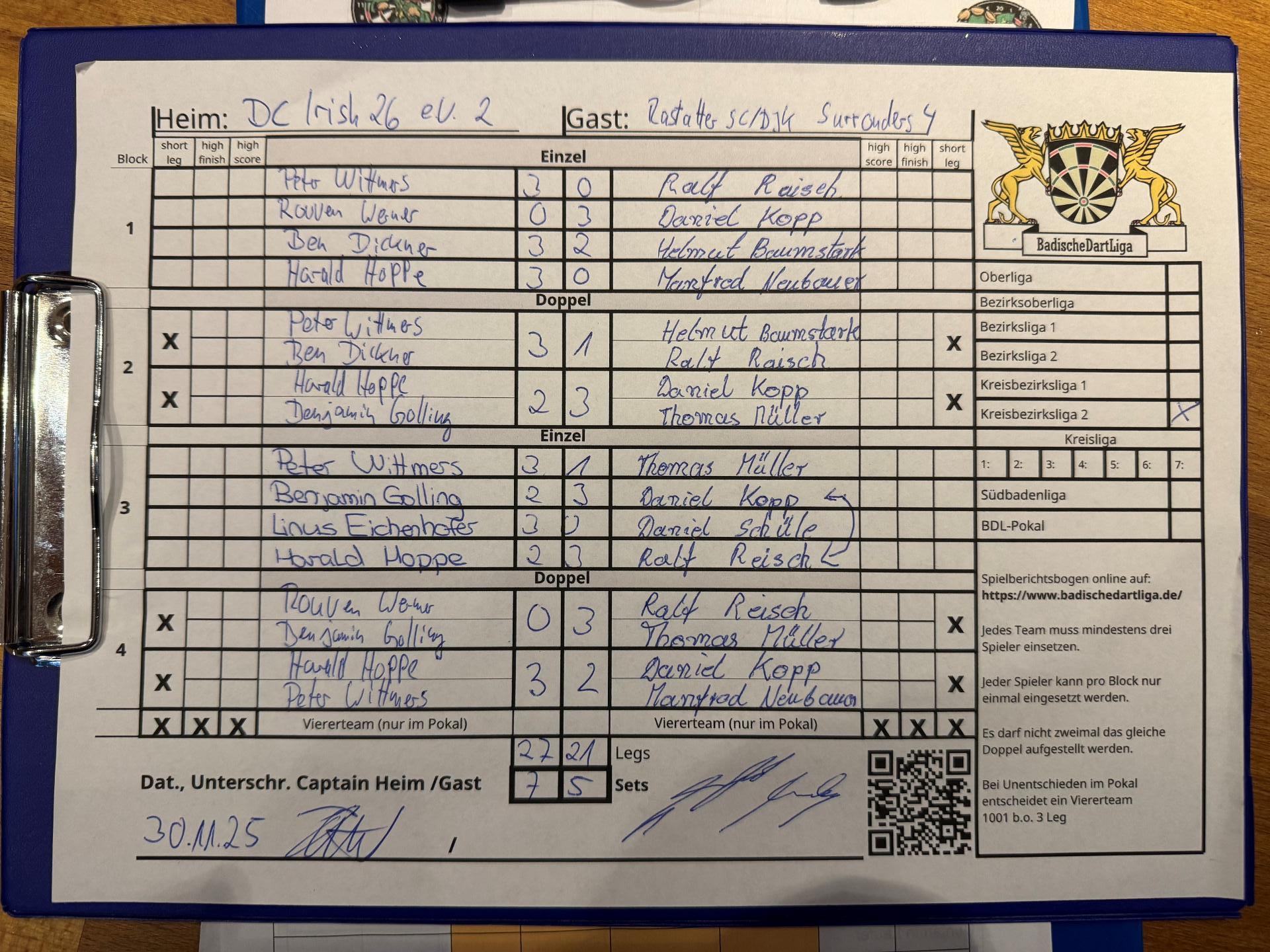 | Ergebnis: | 27 : 21 | - Legs | ||||||