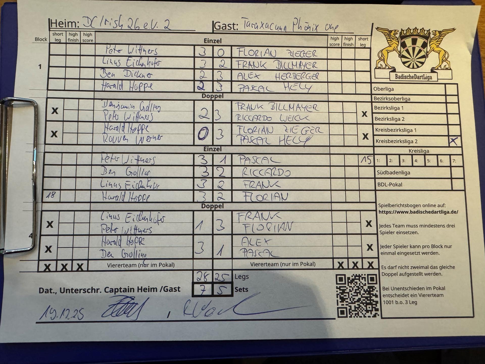 | Ergebnis: | 28 : 25 | - Legs | ||||||