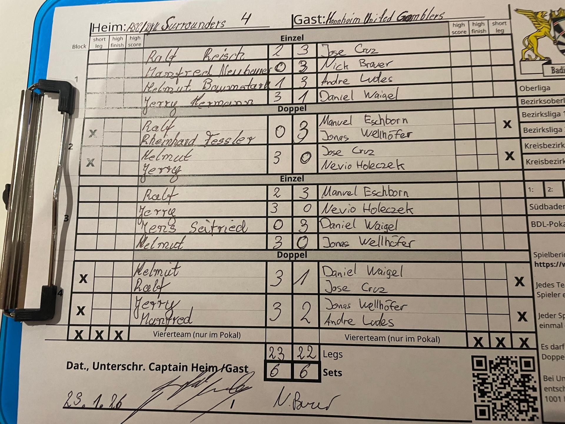 | Ergebnis: | 23 : 22 | - Legs | ||||||