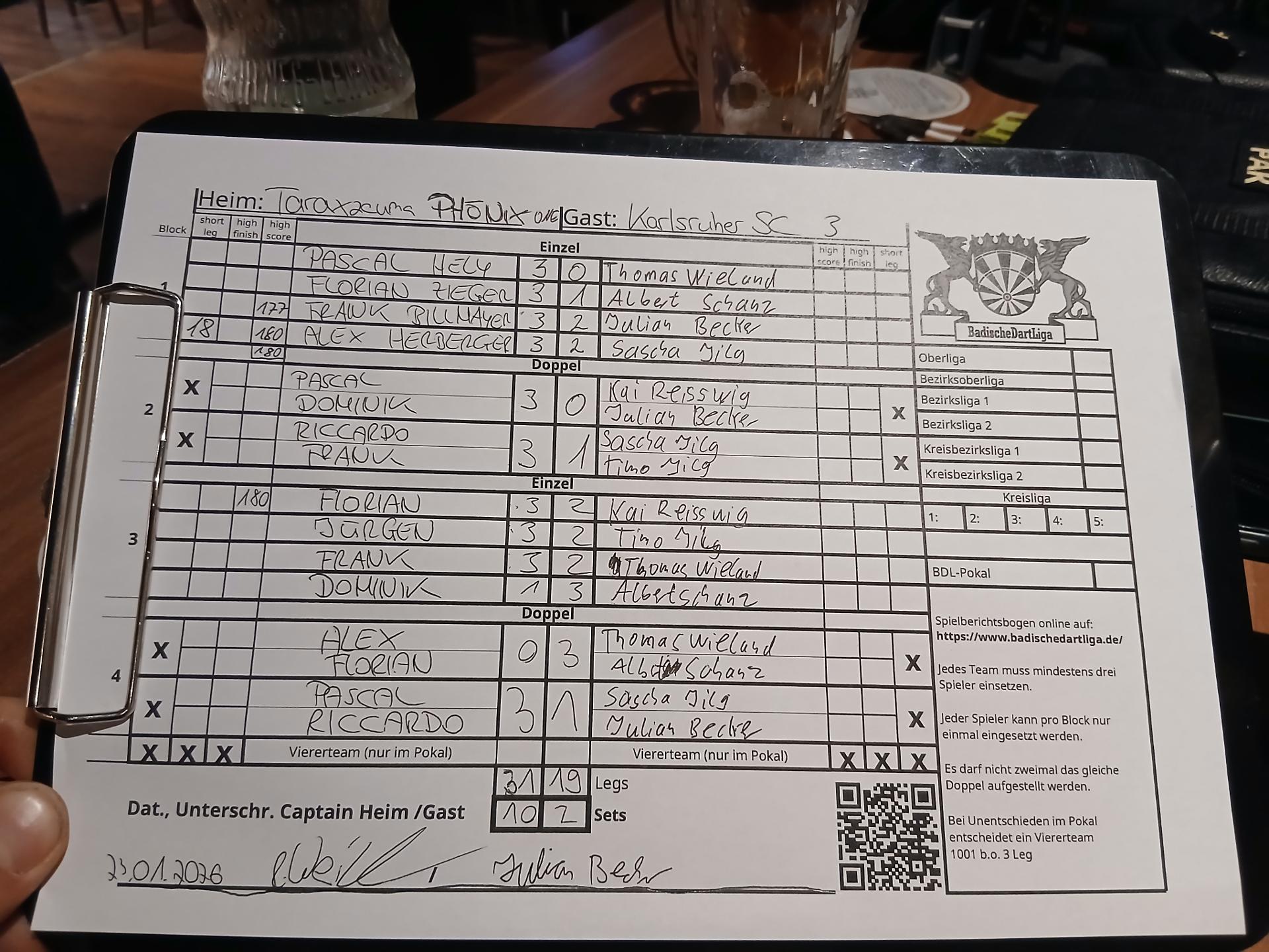 | Ergebnis: | 31 : 19 | - Legs | ||||||