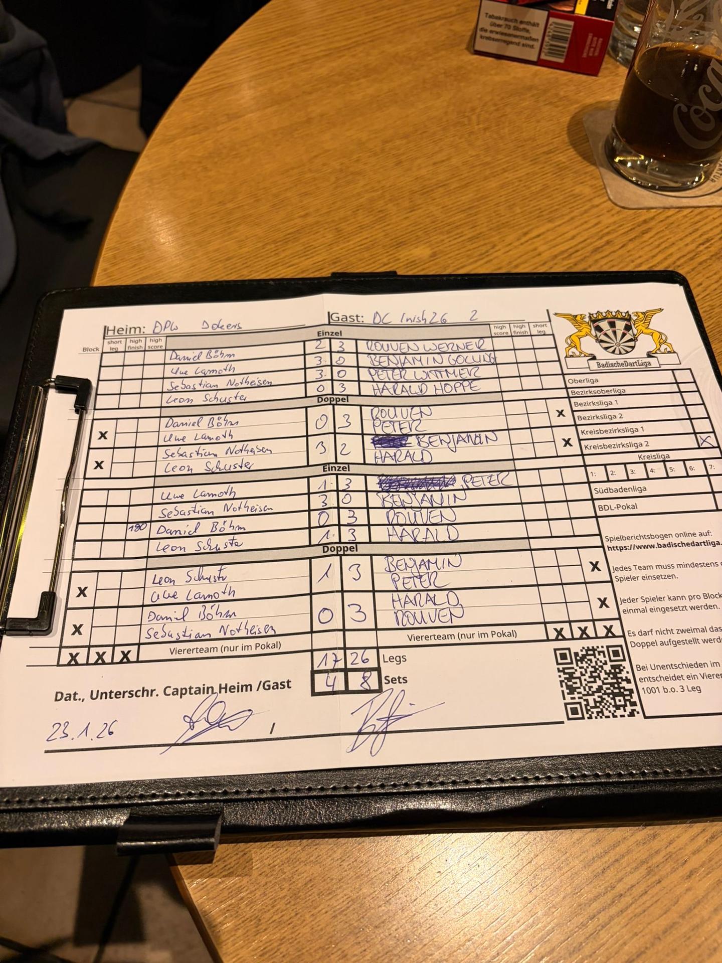 | HEIM: | Darts Pub Walldorf Jokers | GAST: | DC Irish 26 e. V. 2 | |||||